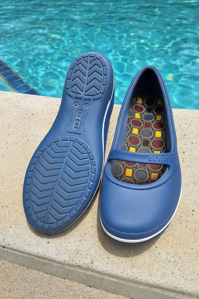 Lightweight, comfortable, and easy to slip on! These Crocs Mary Jane style flats feature a navy blue finish, patterned cushioned insoles, and a secure strap for all-day comfort. Perfect for casual outings, travel, or wearing around the pool. ✨ Features: Women’s Size 8 (W) Lightweight Croslite™ material for all-day comfort Non-slip herringbone tread Colorful patterned insole for a fun touch Easy to clean and quick to dry Condition: Excellent, very gently worn – no stains or damage.