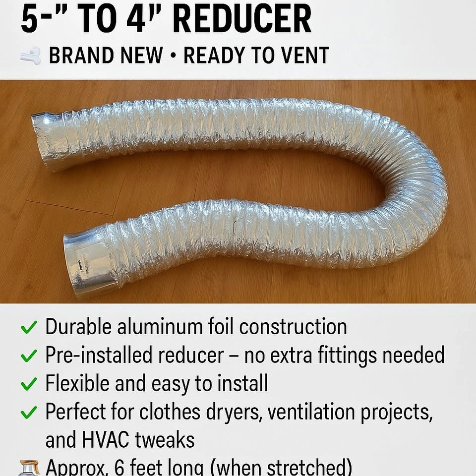 Bought for a project that I decided to do differently. Got a dryer with a 5-inch exhaust and a wall that only takes 4? No sweat. This flexible aluminum transition duct is exactly what you need! It’s 5 inches on one end, 4 inches on the other, perfect for tight laundry spaces, basement setups, or appliance upgrades. ✨ Features: ✔️ Durable aluminum foil construction ✔️ Pre-installed reducer – no extra fittings needed ✔️ Flexible and easy to install ✔️ Perfect for clothes dryers, ventilation projects, and HVAC tweaks 📏 Approx. 6 feet long (when stretched) 🧰 Never used. Just unboxed for pics. Let me know if you're interested!