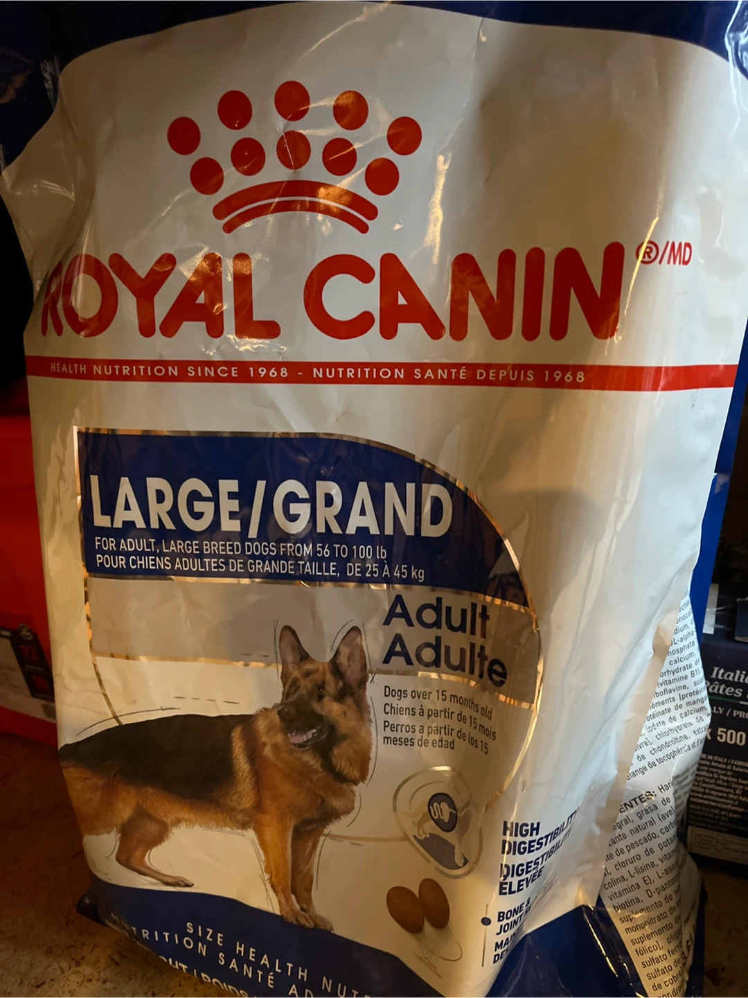 Free half a bag of Royal Canin Large Breed Adult dog food. It's for dogs over 15 months old and between 56 to 100 lbs (25-45 kg).