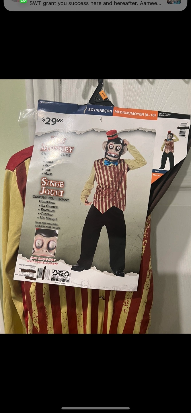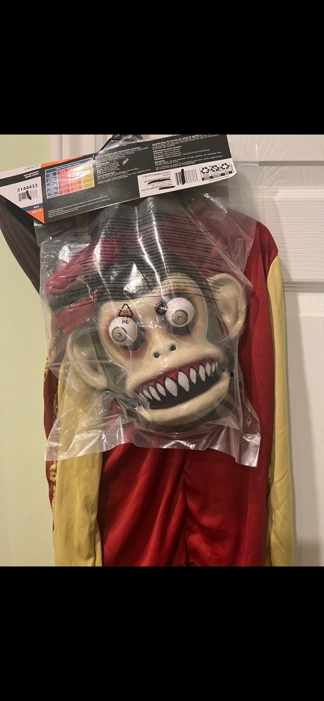 Selling a Toy Monkey costume for boys, size medium (8-10). The costume includes a shirt, vest, pants, and mask. It's in new condition and ready for Halloween or dress-up fun!