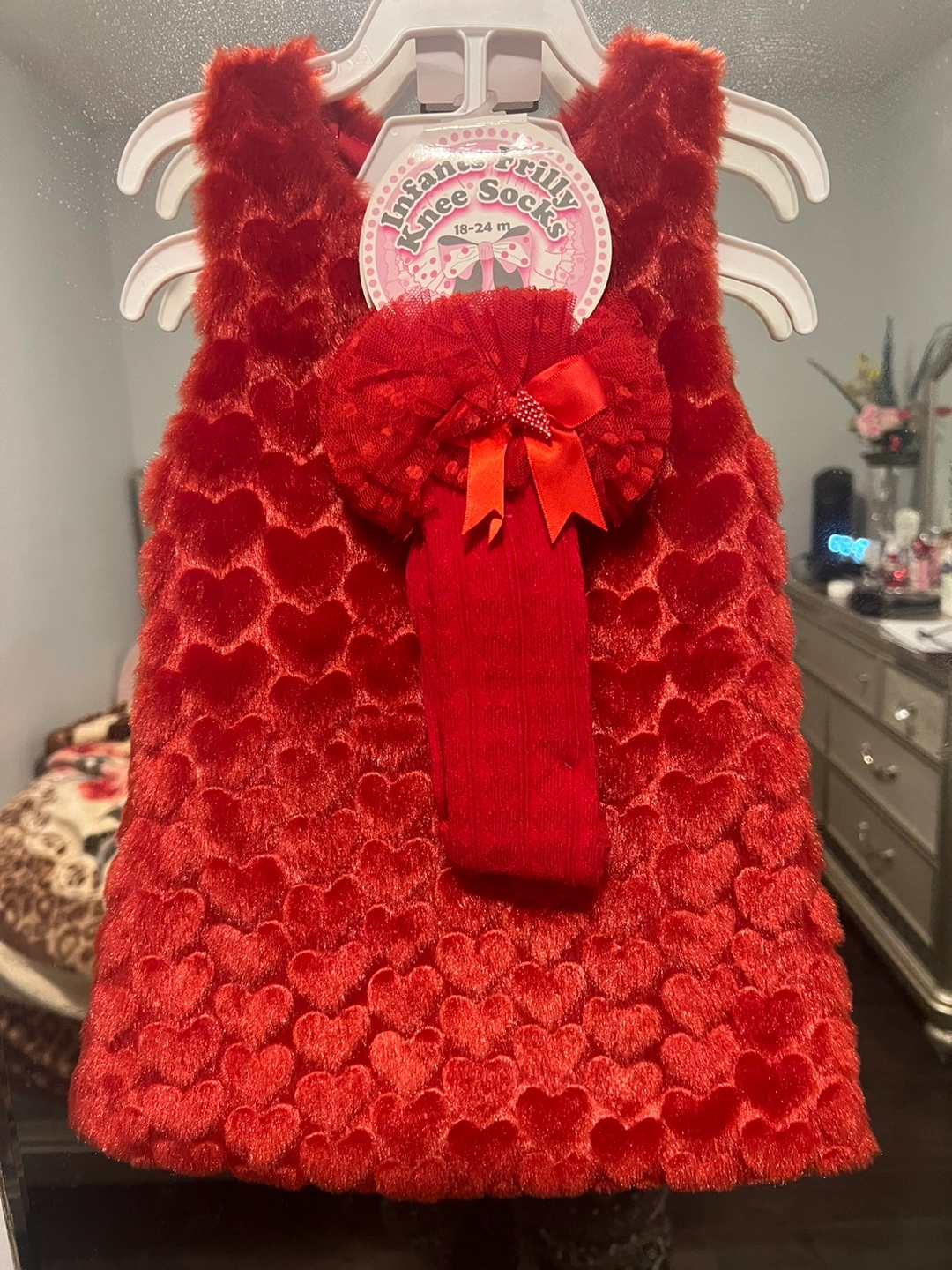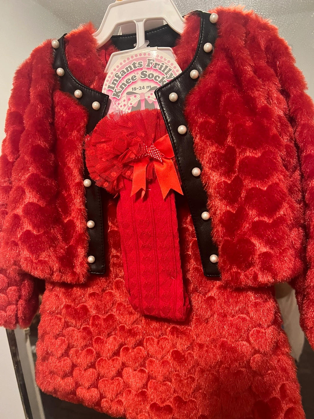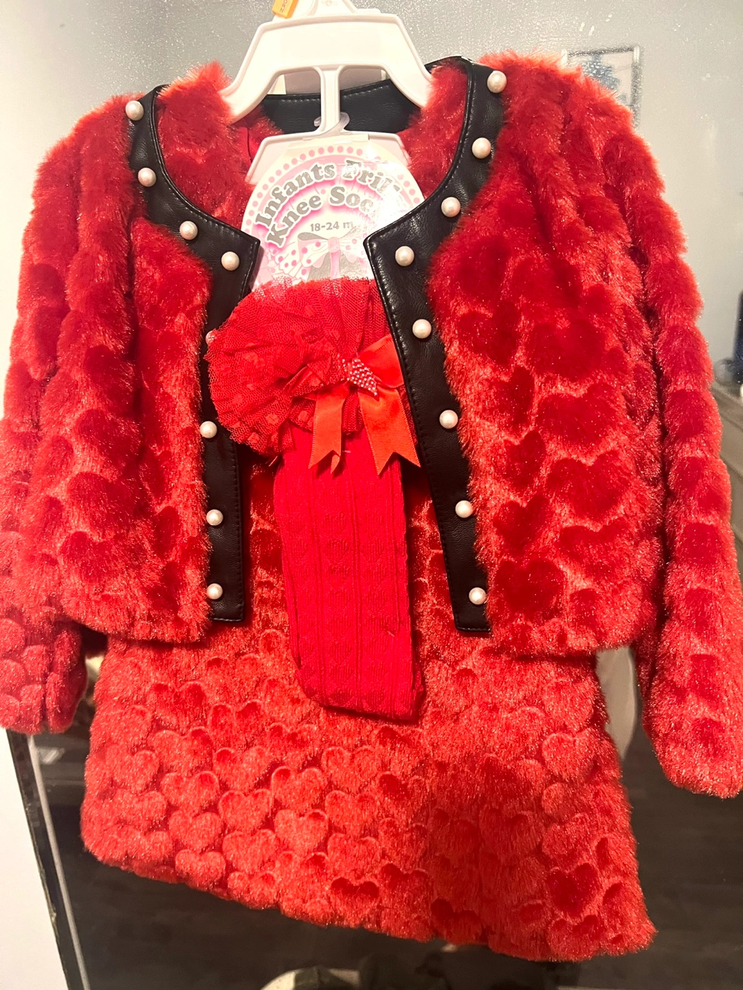 Super cute red heart-patterned outfit for infant girls! Includes a jacket, dress, and frilly knee socks. Size is 18-24 months. Perfect for a special occasion!