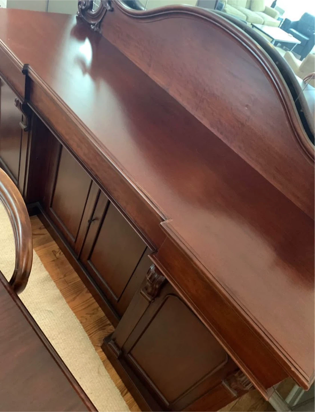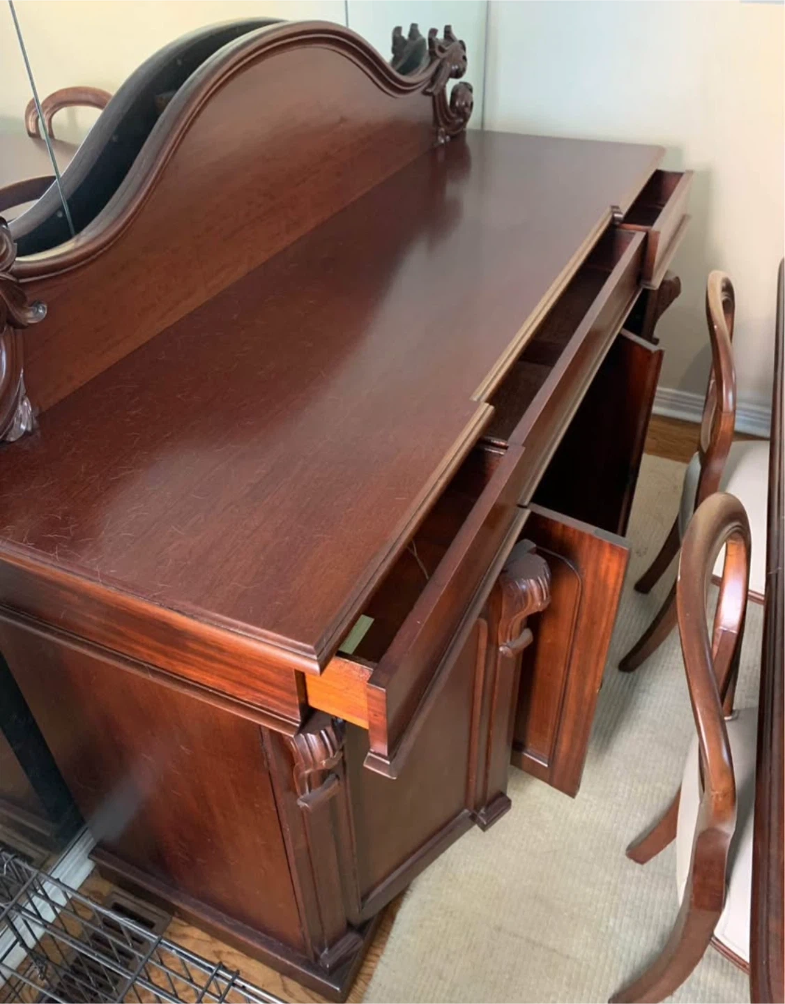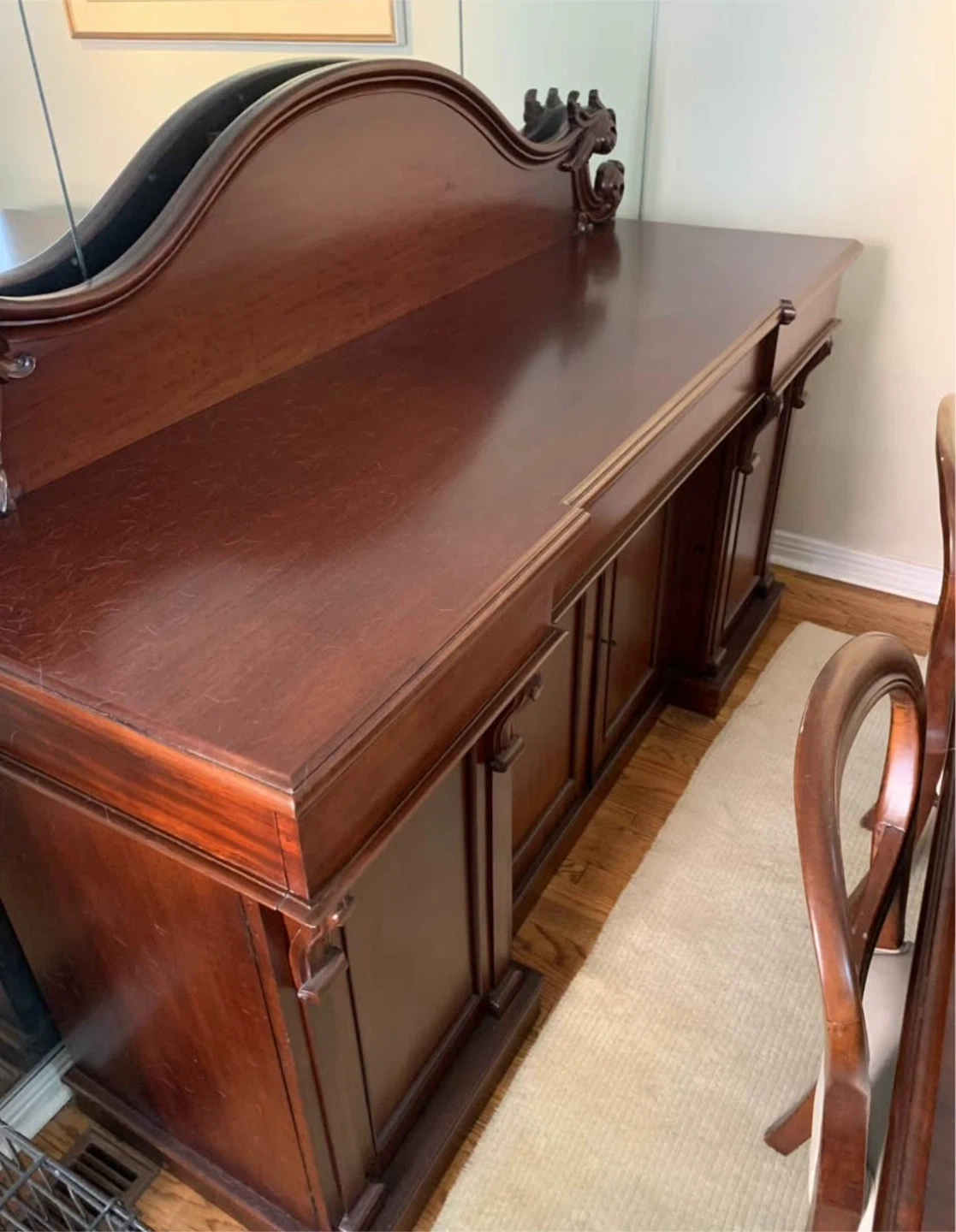 Selling a beautiful antique wood buffet with a mirror. It features ornate detailing and a rich, dark wood finish. Perfect for adding a touch of elegance to your dining room or living space! It has drawers and cabinets for storage Wooden buffet … mahogany 3 drawer and 4 cubbies built into unit. Vintage. Amazingly well maintained with not scratches Height - (backboard) 52” Height table top - 36” Width - 72” Depth - 23” Near summerhill subway station