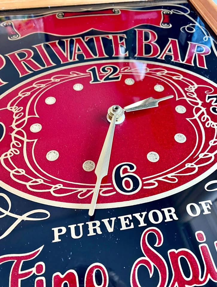 Time to bring some vintage charm to your bar, lounge, garage, or basement hangout! This awesome "Private Bar" wall clock is both a functional timepiece and a playful décor piece. There's space at the top to personalize it with your name – perfect for making your guests feel like VIPs in your very own speakeasy. 🕰️ Working clock with a bold, easy-to-read face 🍷 Says: “Purveyor of Fine Spirits to Fine Friends” 🛠️ Sturdy wooden frame, ready to hang 🎨 Room to personalize with a name or logo 🧼 Condition: Great shape, clean and full of character! This baby is ready to turn any room into your private bar. All it needs is your name—and maybe a drink in hand. 🍸 PERSONALIZATION TO BE COMPLETED BY THE PURCHASER