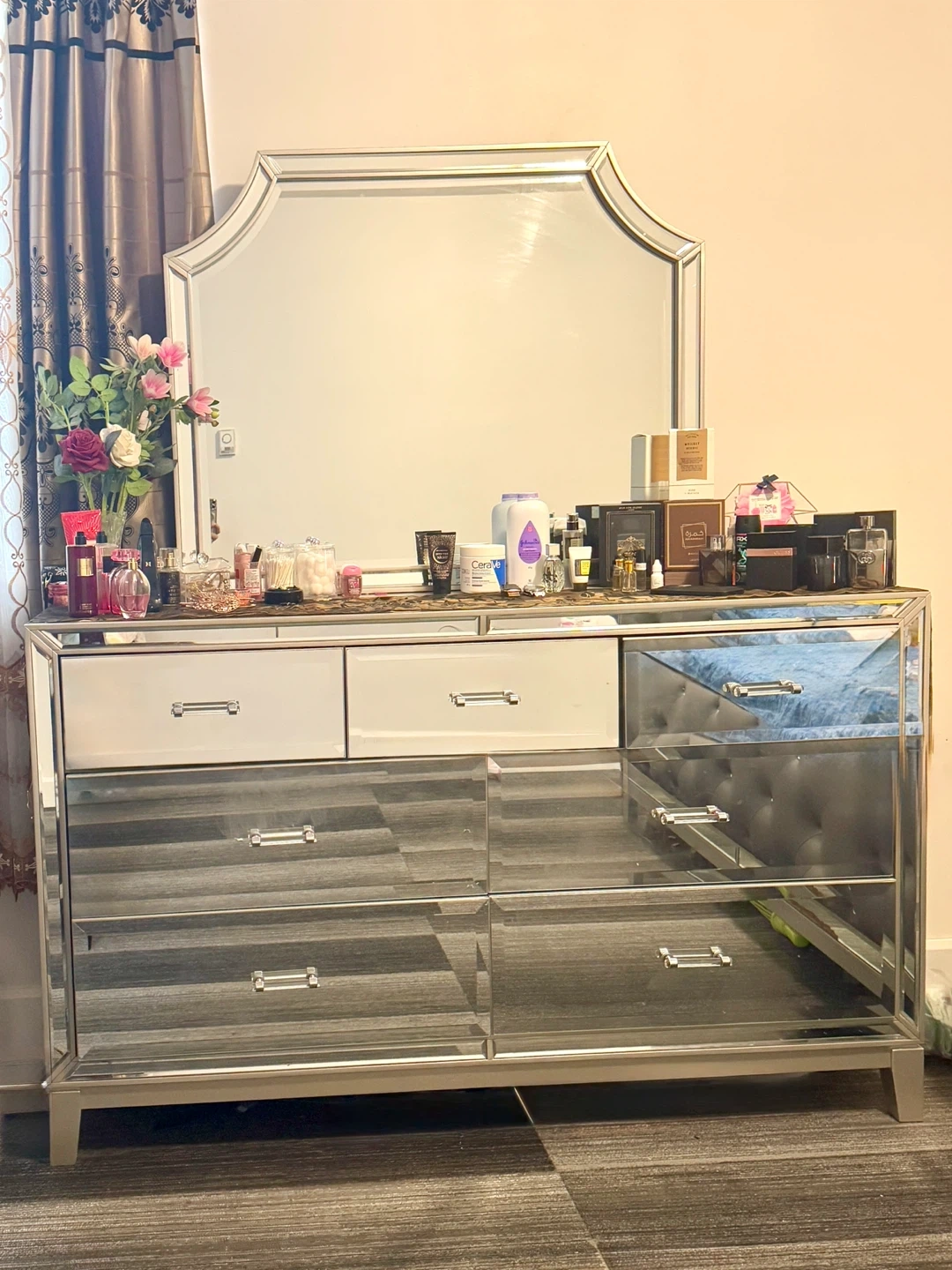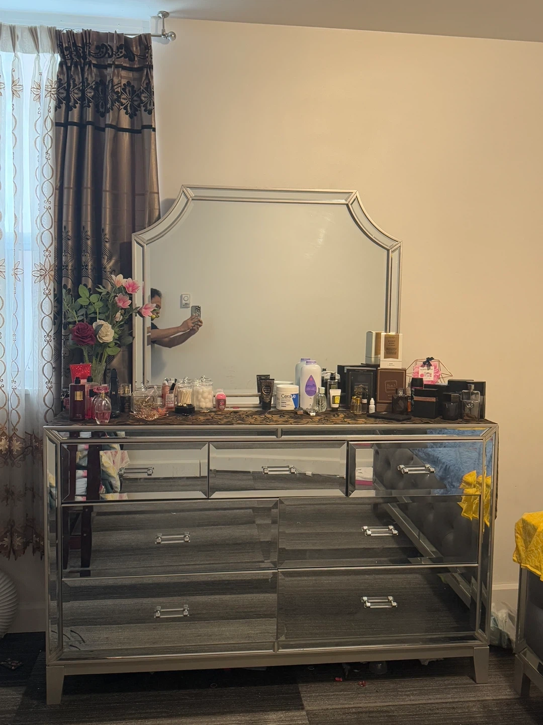 Selling a mirrored dresser with an attached mirror. It has a sleek, modern look that would add a touch of glam to any bedroom! It features multiple drawers for ample storage space. The mirror is in great condition and provides a clear reflection. Perfect for organizing your clothes and getting ready!