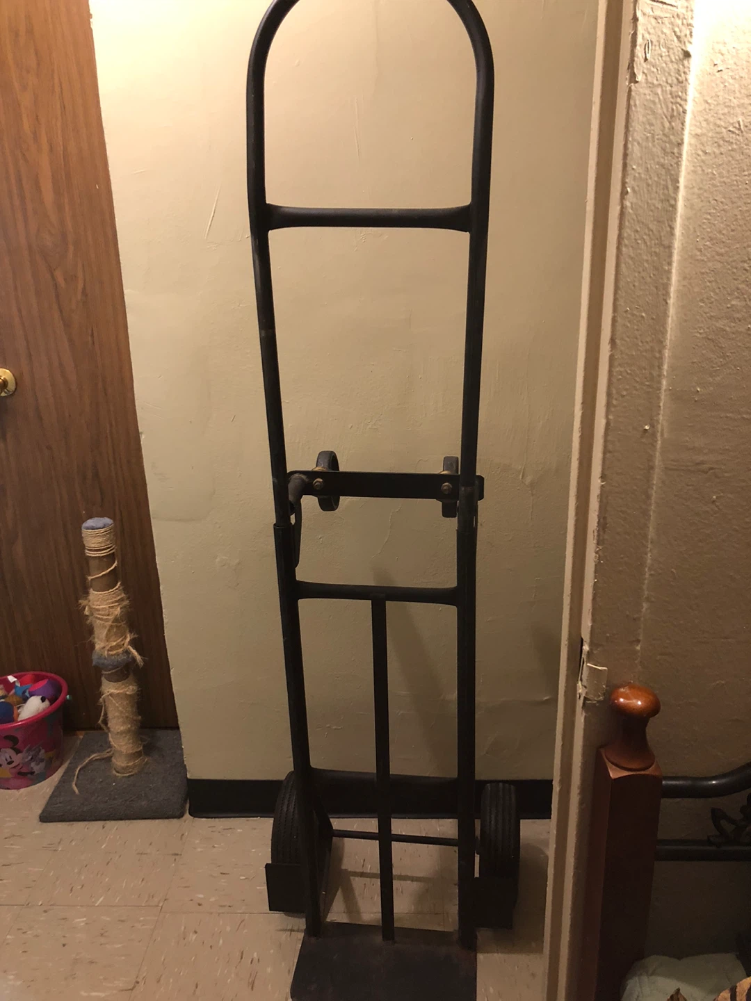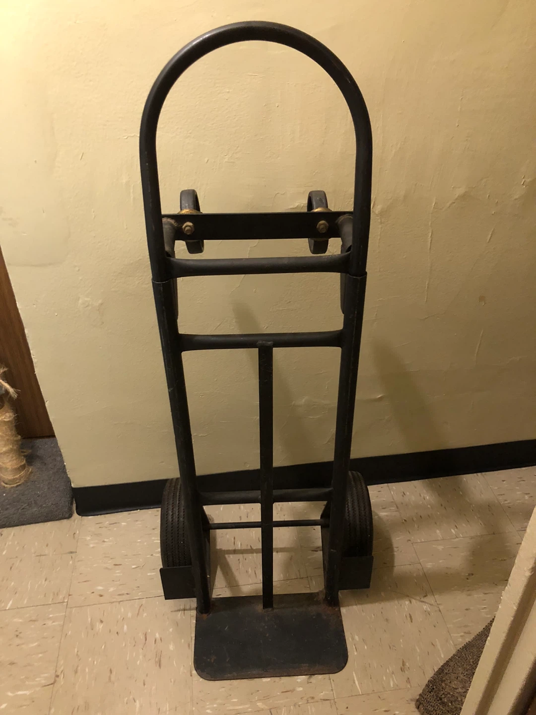 This is a used hand truck dolly that I found thought somebody can benefit from it. It's black and has two wheels. It's perfect for moving heavy items around the house or office. It has some signs of wear but is still in good working condition. The wheels do need air