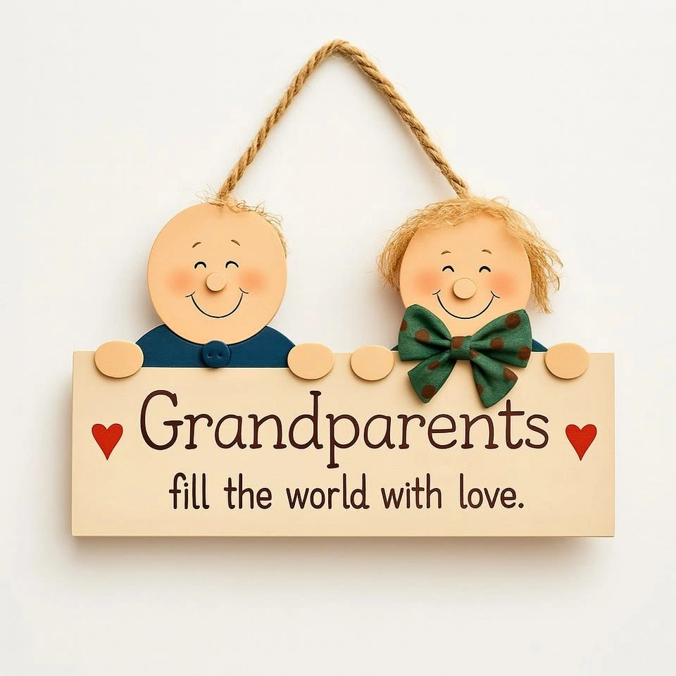 Celebrate the warmth and joy of grandparents with this charming handcrafted hanging sign! Featuring two cute wooden characters and the heartfelt message “Grandparents fill the world with love”, it’s perfect for adding a loving touch to any home décor. 🎁 A thoughtful gift for Grandparents Day, birthdays, or baby announcements 🏡 Ideal for entryways, nurseries, or cozy corners 🧵 Made with love – includes twine for easy hanging Let Nana and Papa know just how much they mean with this delightful piece!