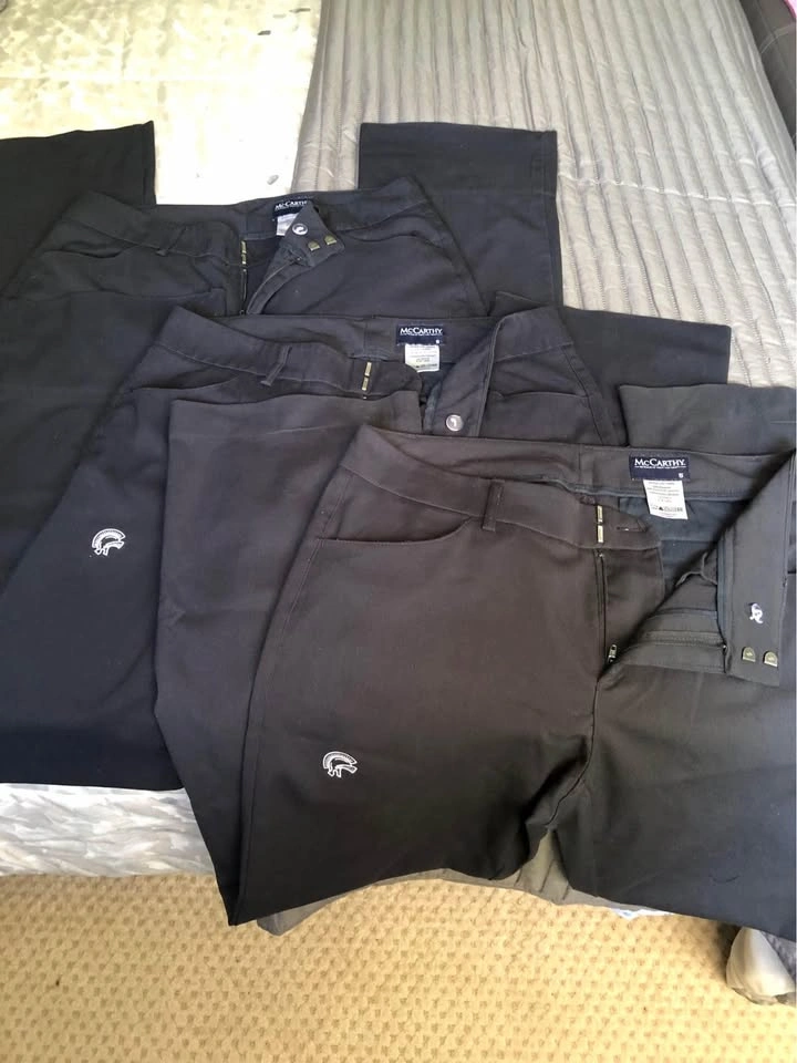 Girls uniform pants used for one semester outgrown. 2 pairs of size 6 - 1 pair size 5, 1 size 4 and 1 size 3 used this past year. Hemmed no rips/tears all buttons and hooks intact. Girls Long sleeve polo and short sleeve size.
