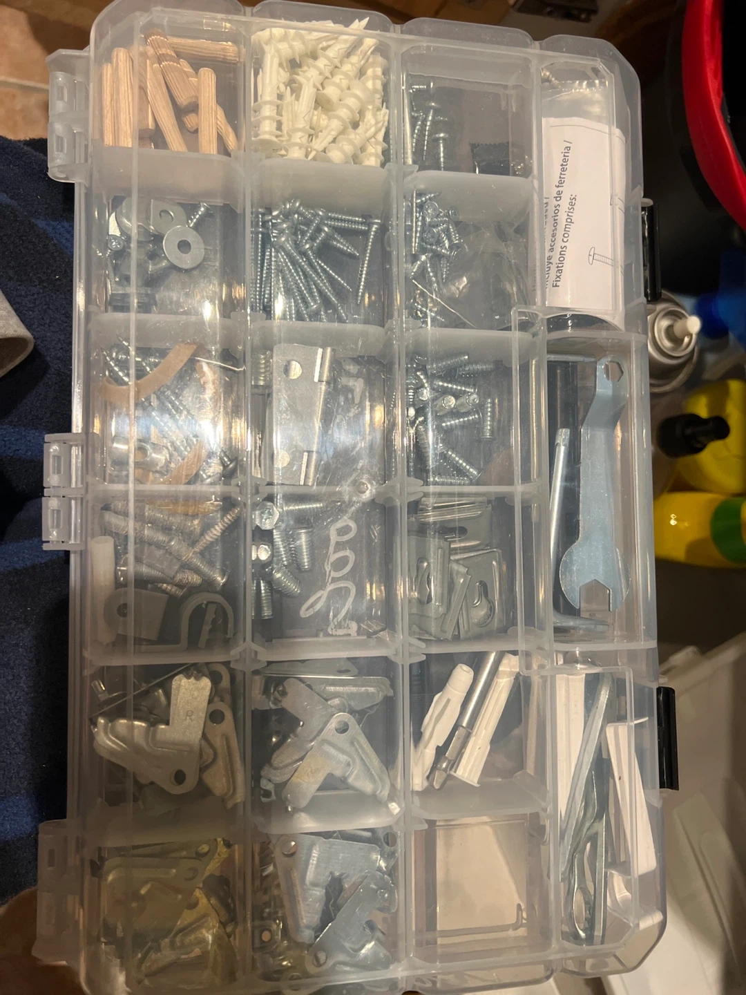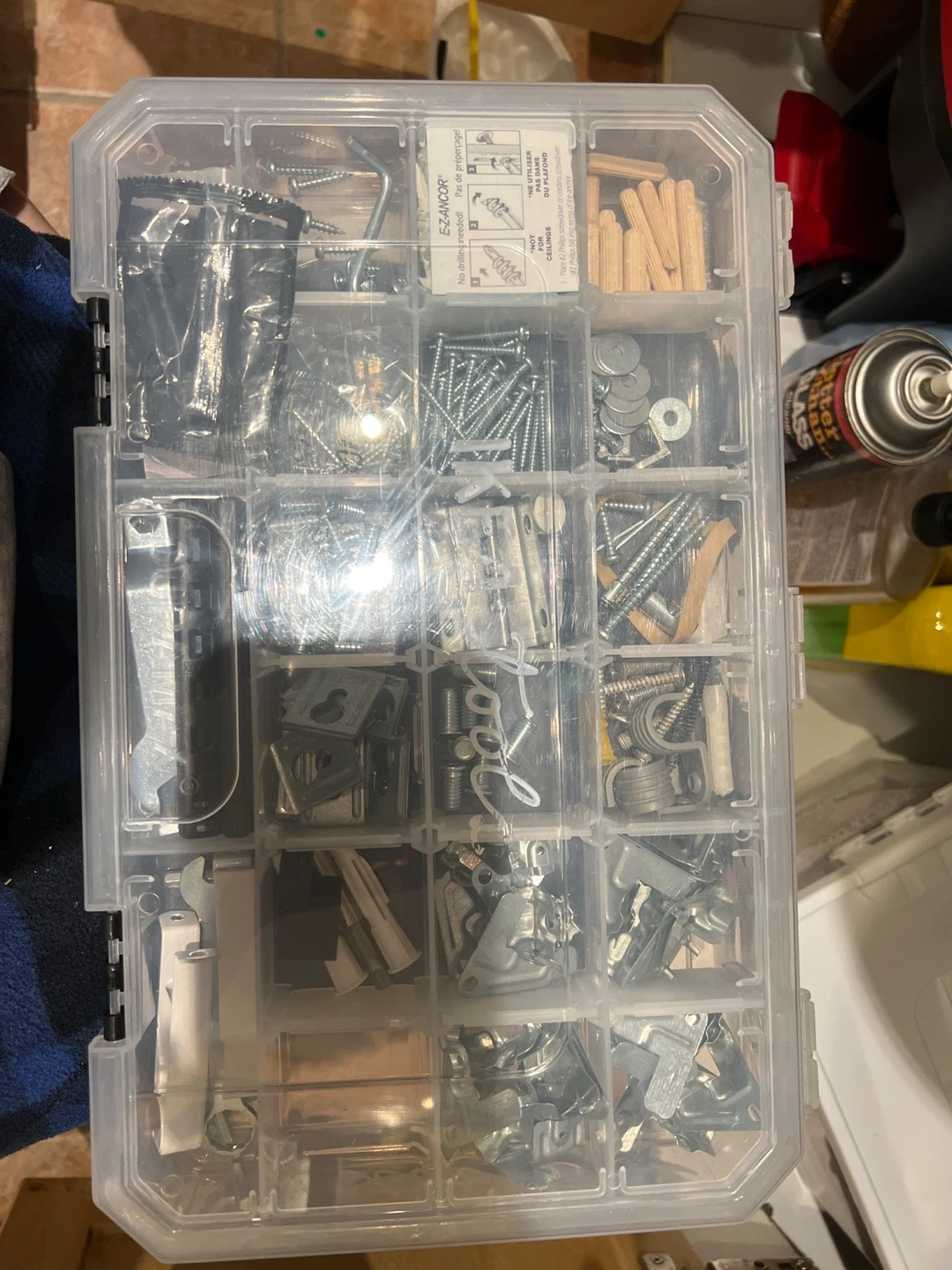 Selling a hardware organizer filled with various screws, nails, and fasteners. Includes E-Z Ancor screws for easy installation without pre-drilling. Great for any DIY projects or home repairs! The kit has tons of IKEA spare parts.