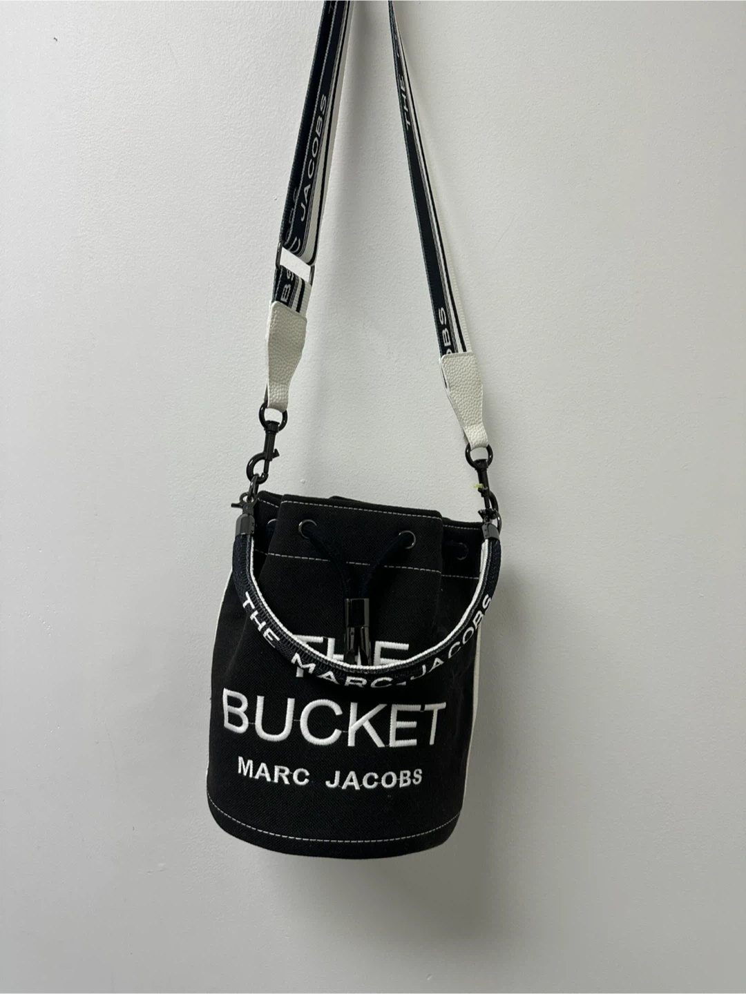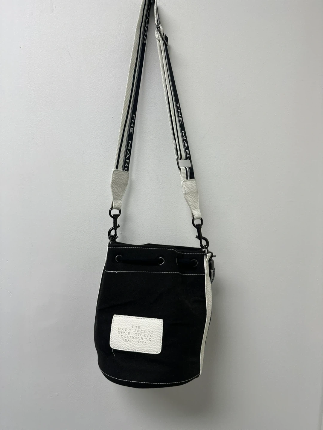 Selling a Marc Jacobs Bucket Bag in black. It's in great condition and ready for a new home! The bag features the brand's name around the top and has a crossbody strap.