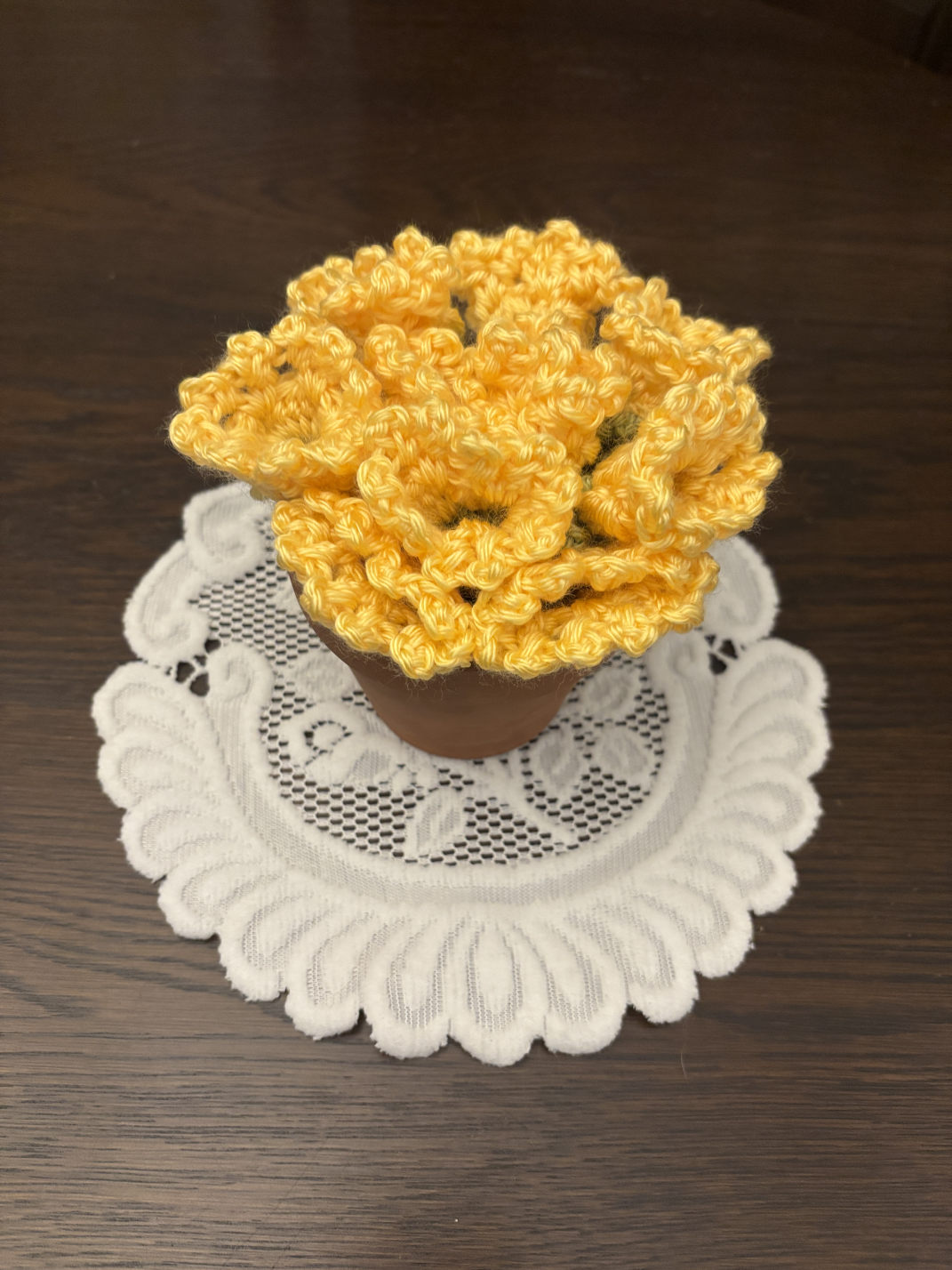 Selling a cute, handmade crochet flower in a little pot! It's a bright yellow and would look great on a desk or shelf. Comes with a white doily.