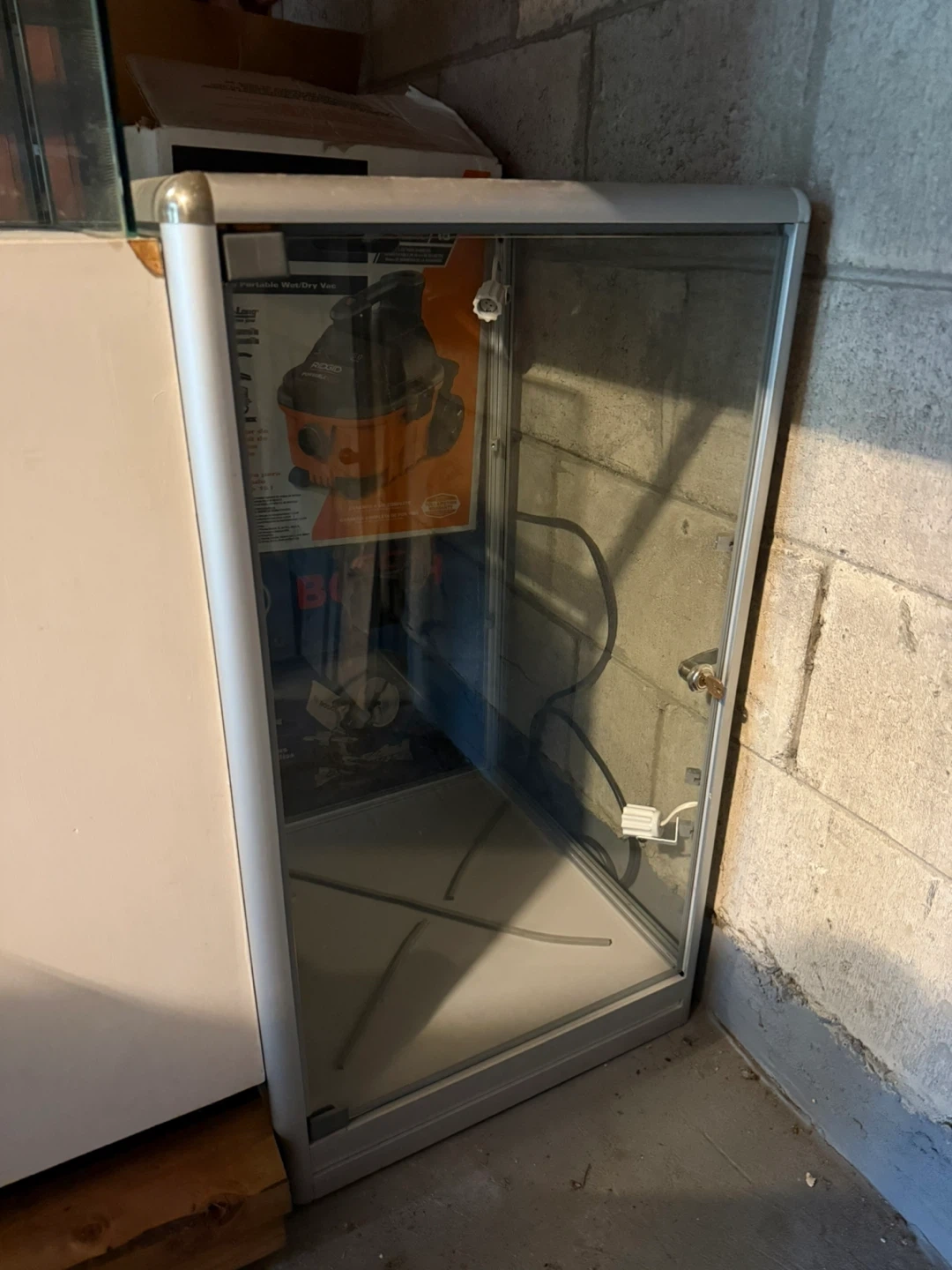 Selling a glass display cabinet. It has a silver frame and a key to lock the door. Inside the cabinet is a Ridgid portable wet/dry vac box.