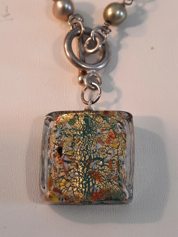 Selling a unique handmade necklacewith 925 silver closings! It features beautiful pearl beads and a square glass pendant with a gold and green design. The necklace is in great condition and ready to be worn