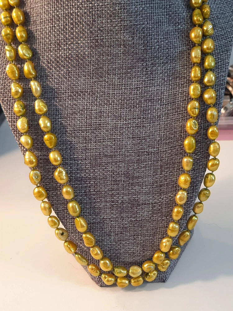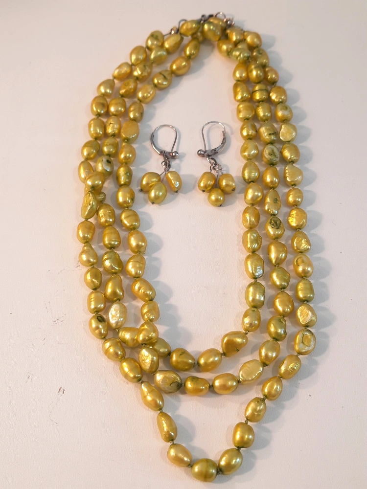 Beautiful golden pearl necklace and earring set. The earrings are sterling silver (.925). The necklace is a three-strand design with a secure clasp 925 silver. The pearls have a lovely lustre fresh water pearls and are in great condition.very London neclase could be ware in 2,3 layers or only very long as you wish Perfect for adding a touch of elegance to any outfit!