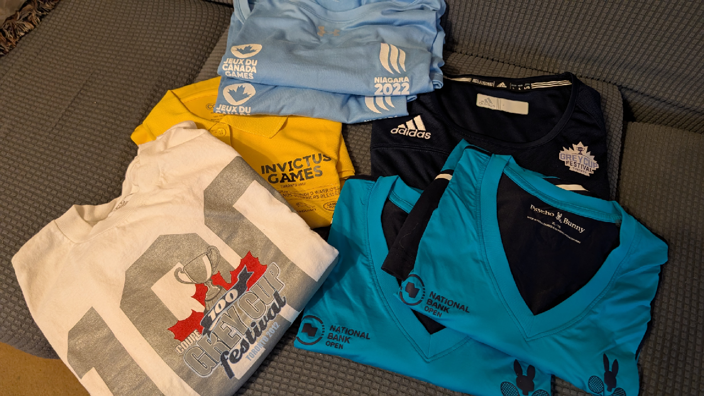 shirts received for volunteering with various sporting events. Invictus, National Bank Open, Grey Cup 100th, Summer Games