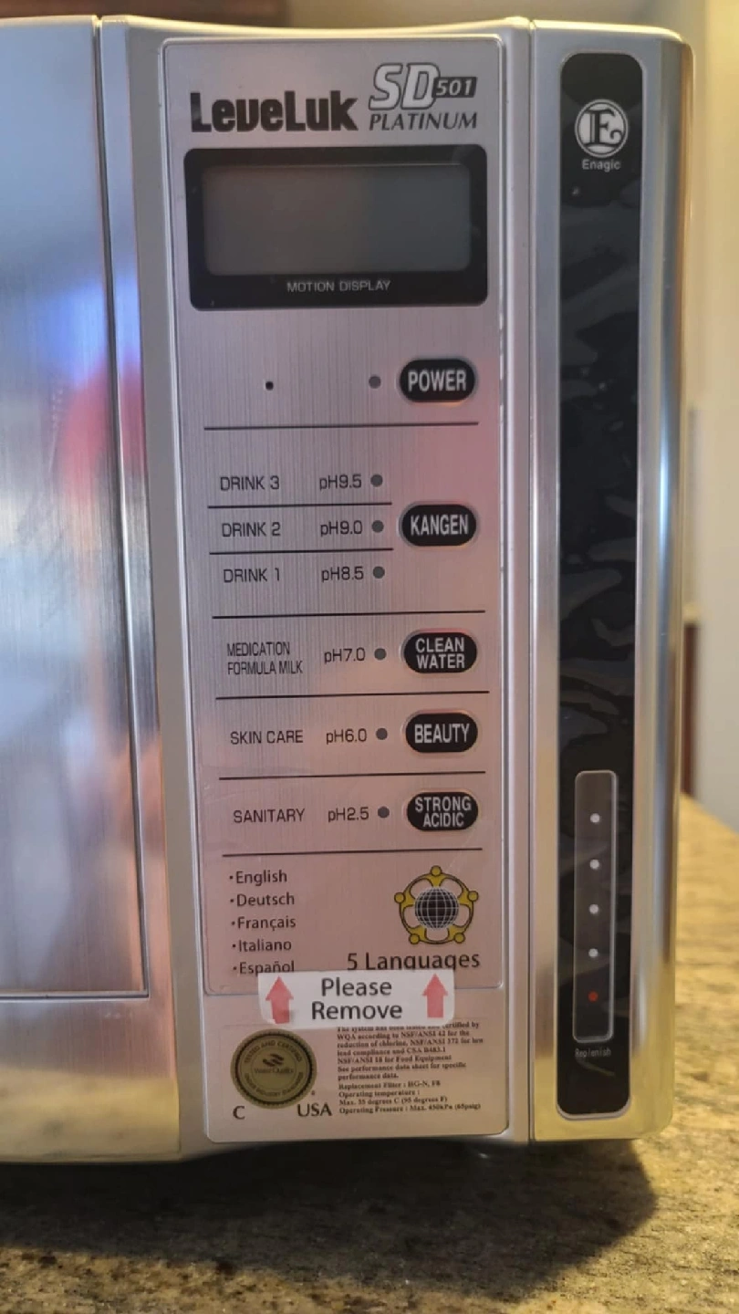 Selling a Leveluk SD501 Platinum water ionizer. It features a motion display and multiple settings for different pH levels, including Kangen water, clean water, beauty water, and strong acidic water. It supports 5 languages: English, Deutsch, Français, Italiano, and Español