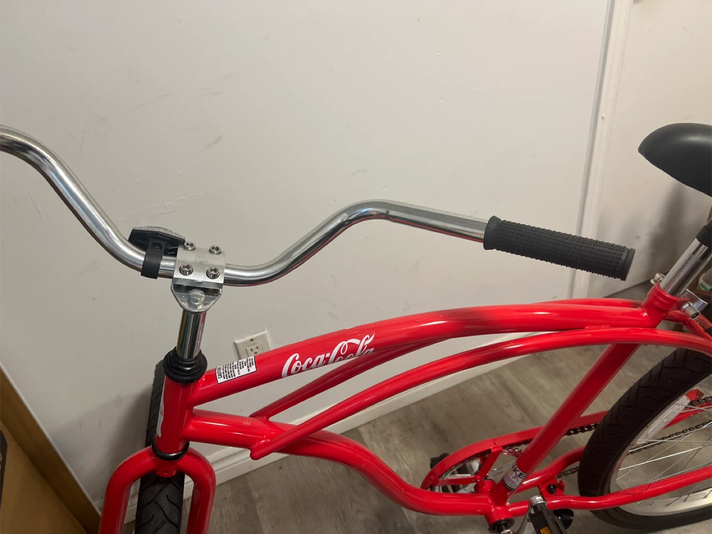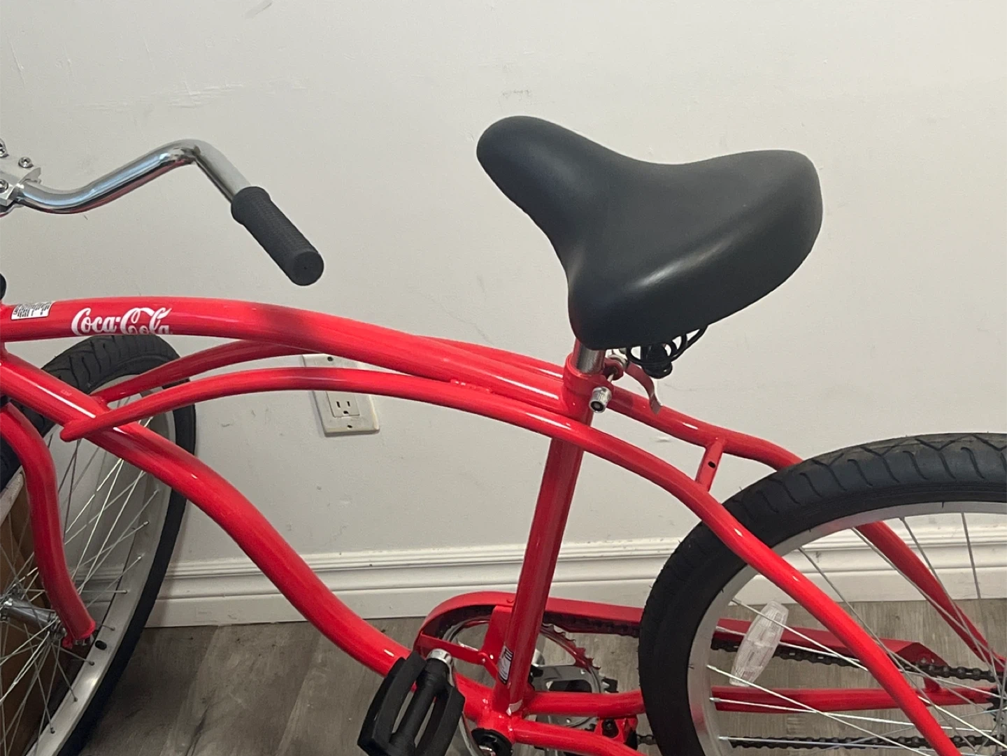 Red cruiser bike. Branded coca-cola but only in one spot. It's barely used and in good condition, ready for a new owner to enjoy some leisurely rides around town!