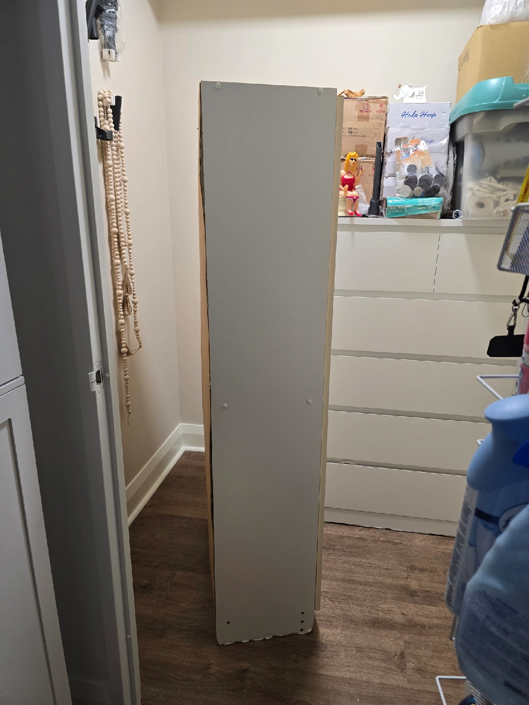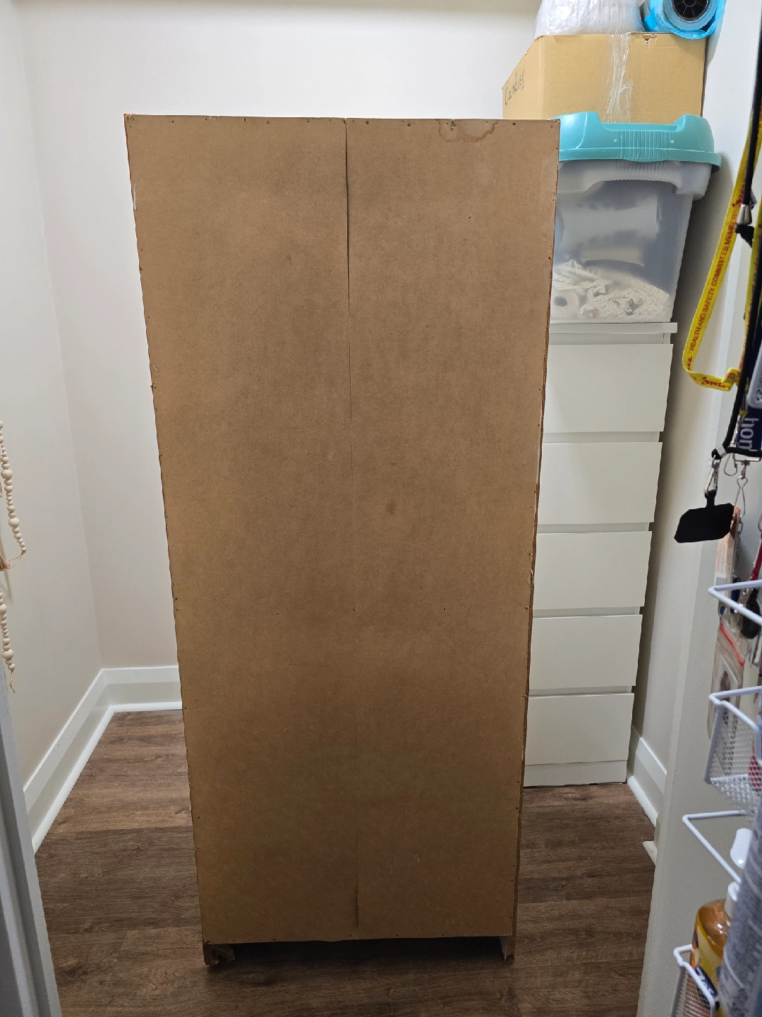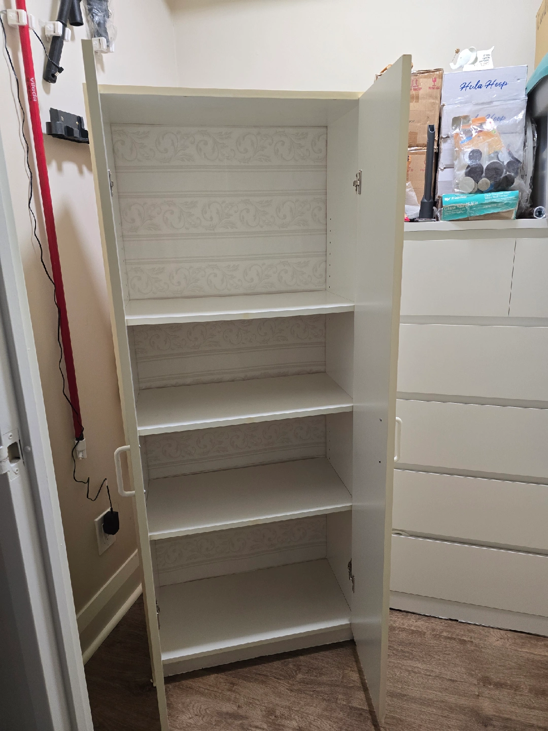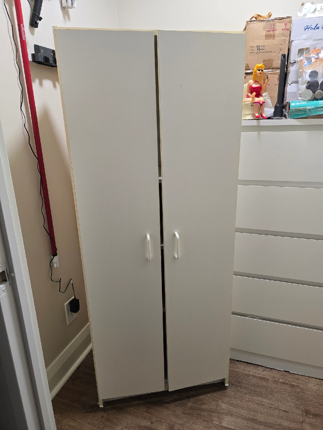 Here's a white wardrobe with shelves, perfect for adding some extra storage space. It has a clean look and is in good condition. It's a great piece for organizing your clothes or other items!