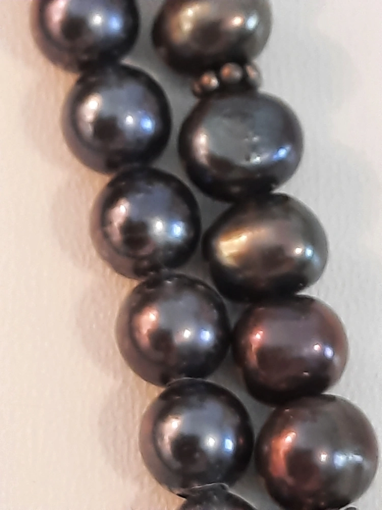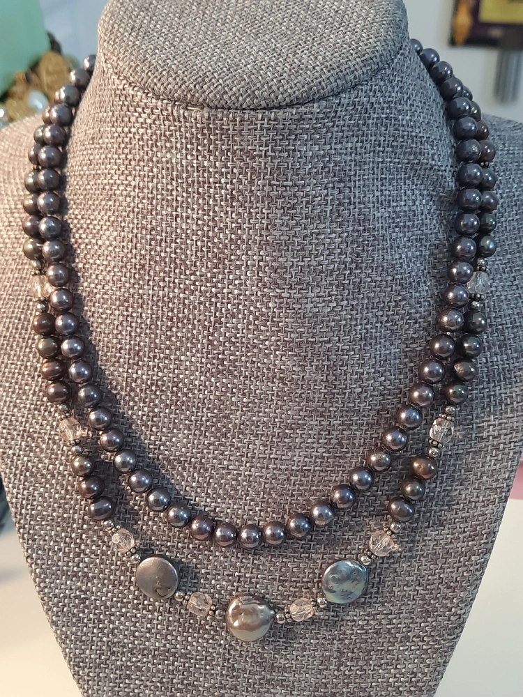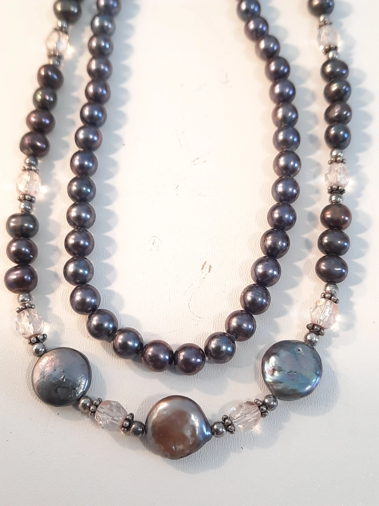 Beautiful black pearl necklace in great condition! This two-strand necklace features lovely black pearls and some crystal accents. It's a stylish piece that would be a great addition to any jewelry collectionone is with 925 silver closings