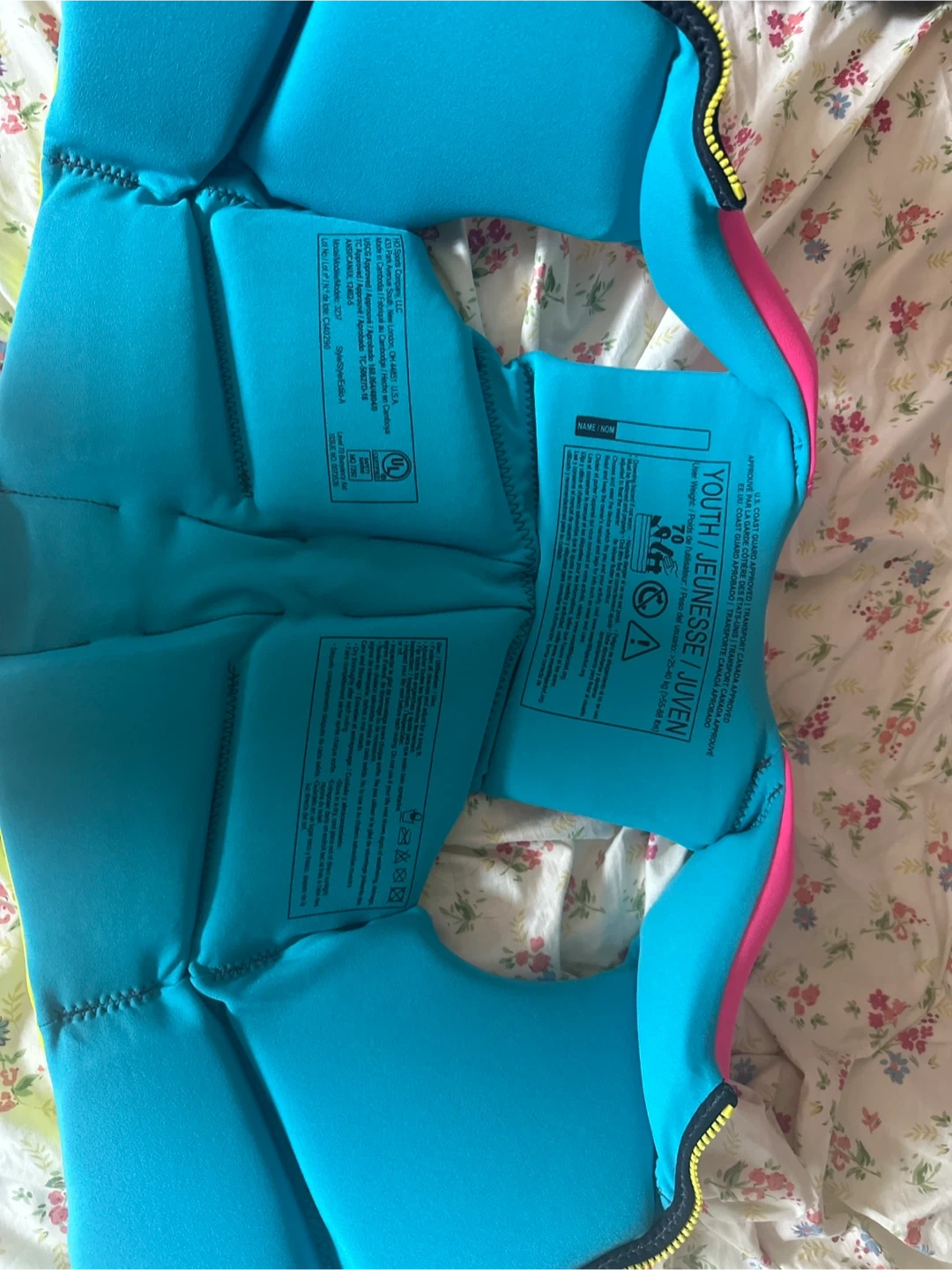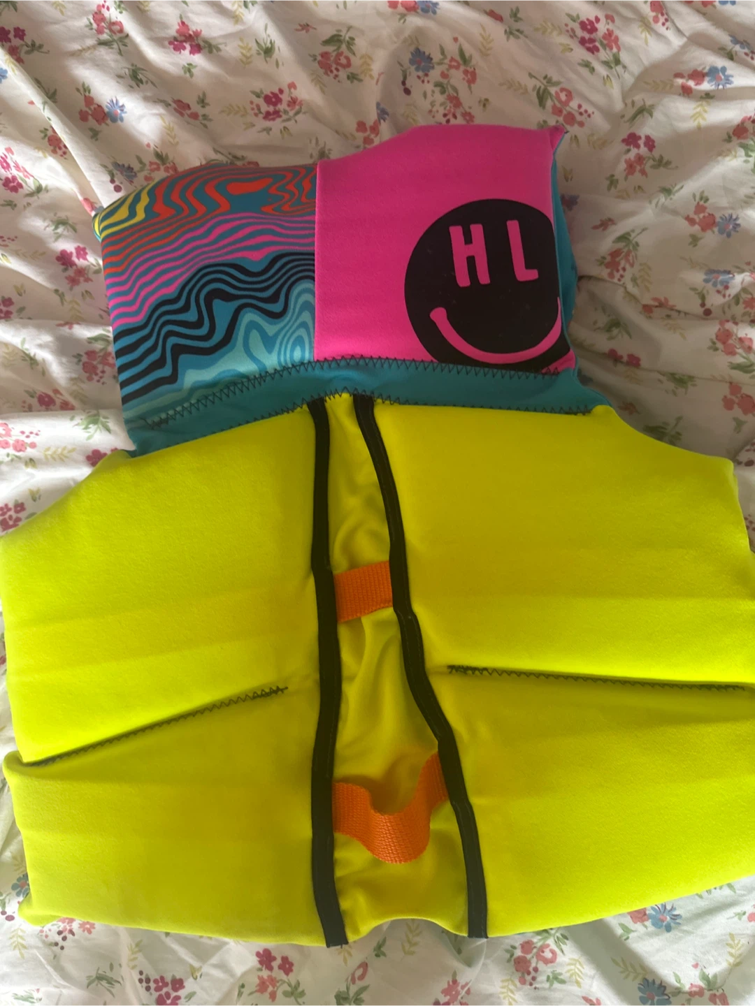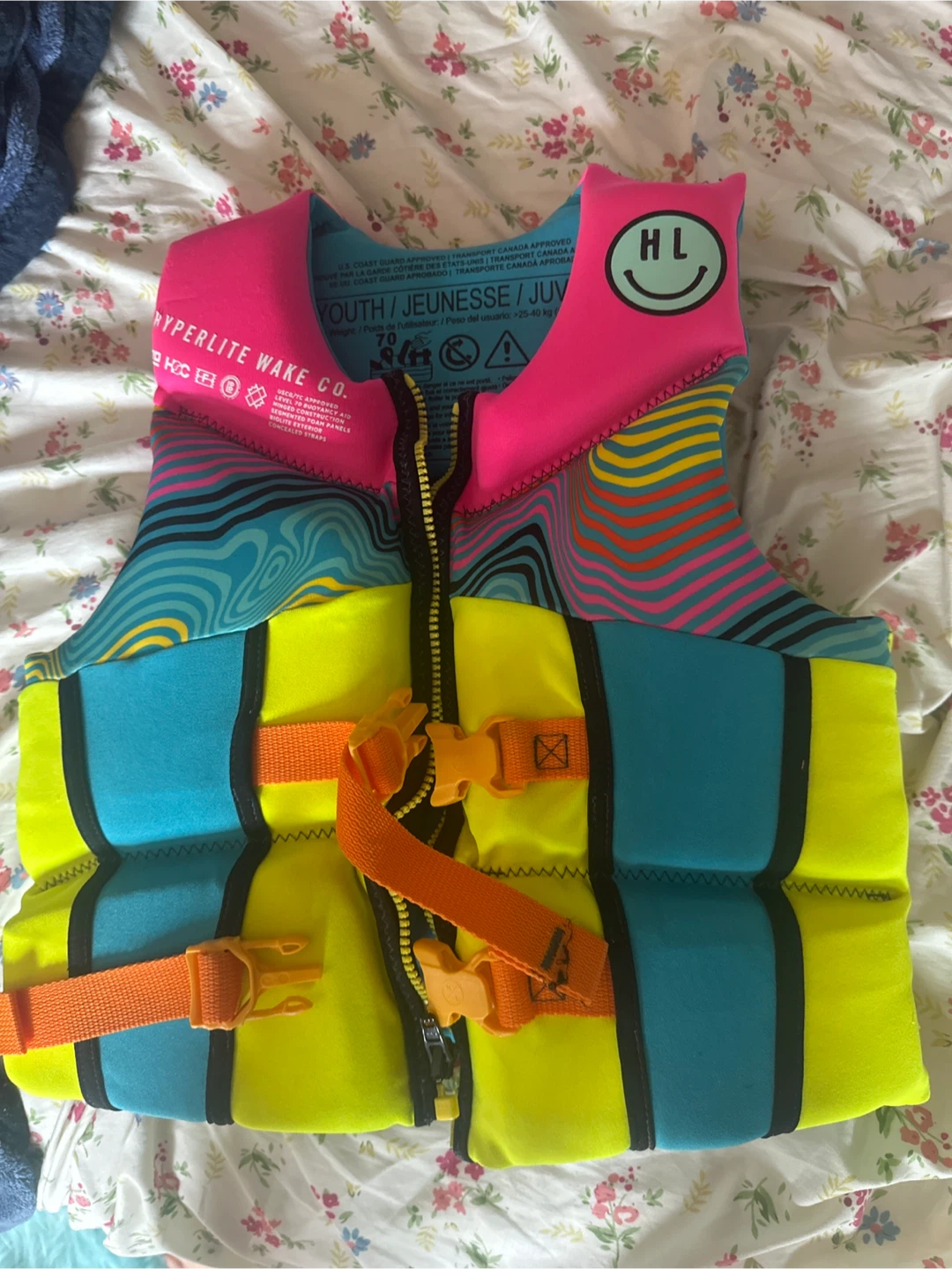 Selling a Hyperlite Wake Co. youth life jacket! It's in great shape and ready for some fun on the water. The jacket features a cool design with bright colours like pink, yellow, and blue. Perfect for keeping your little one safe and stylish!