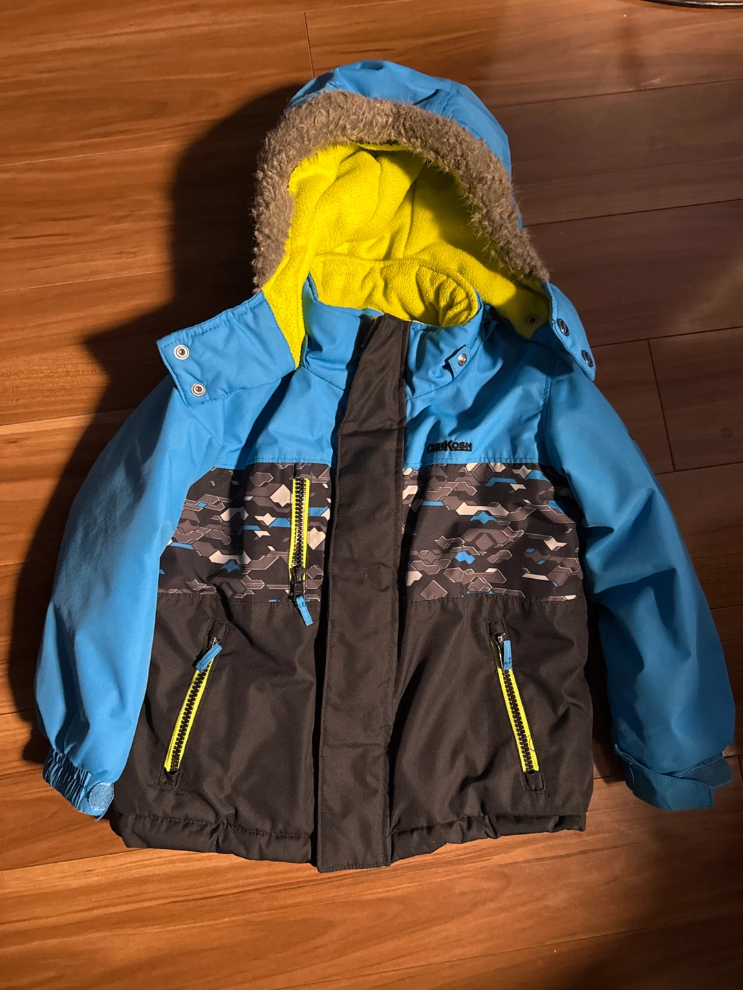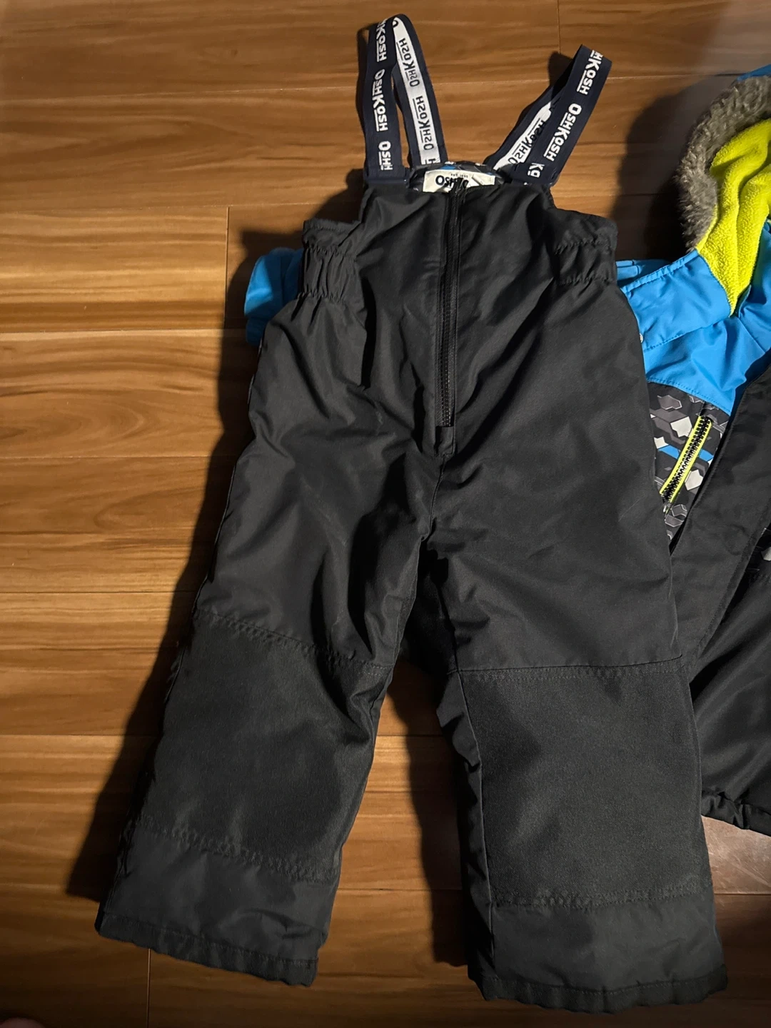 OshKosh B'gosh snowsuit set, perfect for keeping your little one warm this winter! The set includes a jacket and snow pants with adjustable straps. The jacket features a hood and zippered pockets. Great for outdoor play!