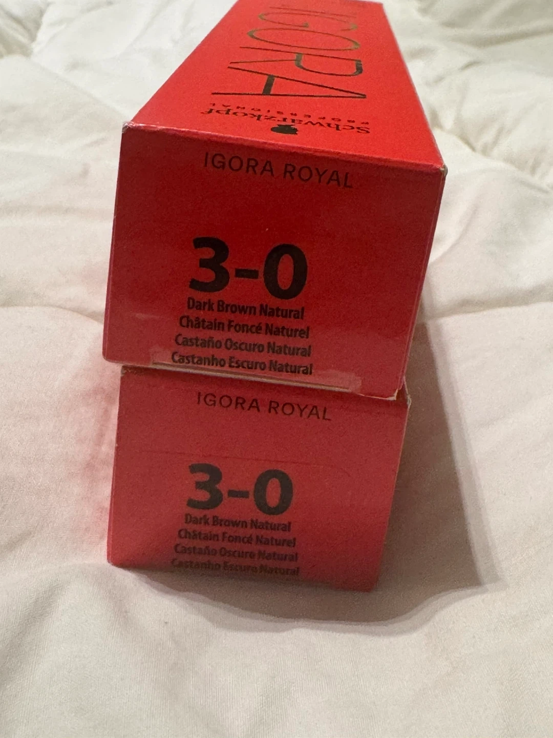 I'm selling two boxes of Schwarzkopf Igora Royal permanent hair colour creme in shade 3-0, Dark Brown Natural. Each box contains 60g / 2.1 oz of product. These are brand new and ready for a new home!