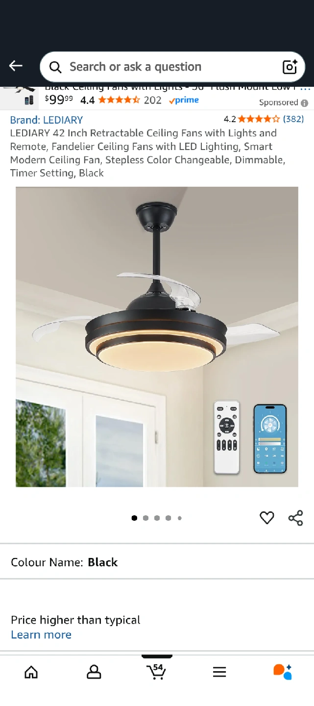 Selling a LEDIARY 42 inch retractable ceiling fan in black. It comes with lights and a remote. It's a fandeliar ceiling fan with LED lighting, smart modern ceiling fan, stepless colour changeable, dimmable and has a timer setting. Powerful & Quite, Max 220r/min rotation rate of the motor and Max 30dB Mute Operation. Includes the box!
