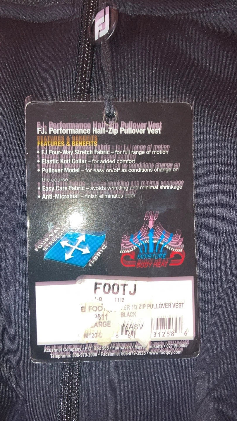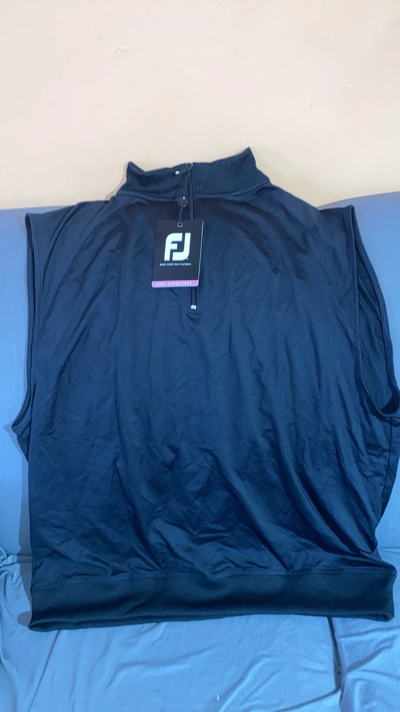 Looking to sell a FootJoy Performance Half-Zip Pullover Vest in black, size large. It's designed with four-way stretch fabric for full range of motion and an elastic knit collar for added comfort. The pullover model allows for easy on/off as conditions change on the course. It's also made with easy-care fabric to avoid wrinkling and minimize shrinkage, plus an anti-microbial finish to eliminate odour. Pickup near Islington and Steeles