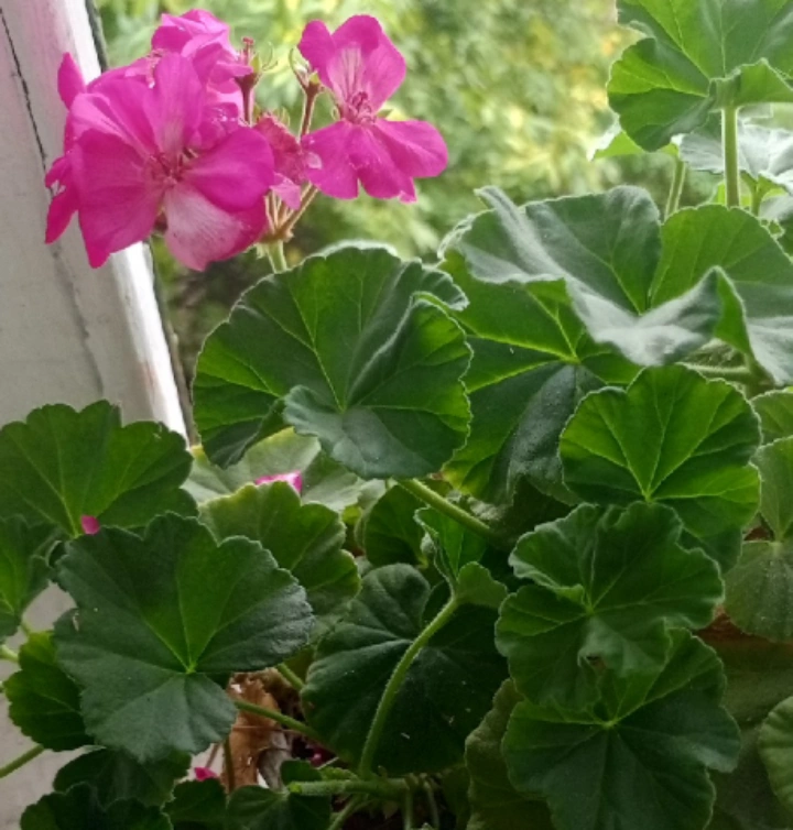 Healthy geranium plant in a black pot, approximately 11 inches tall.