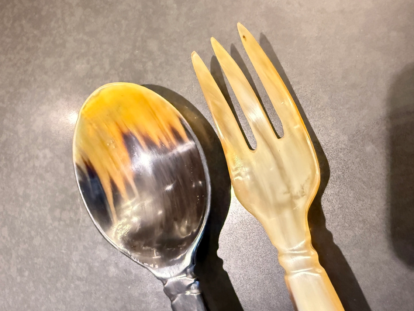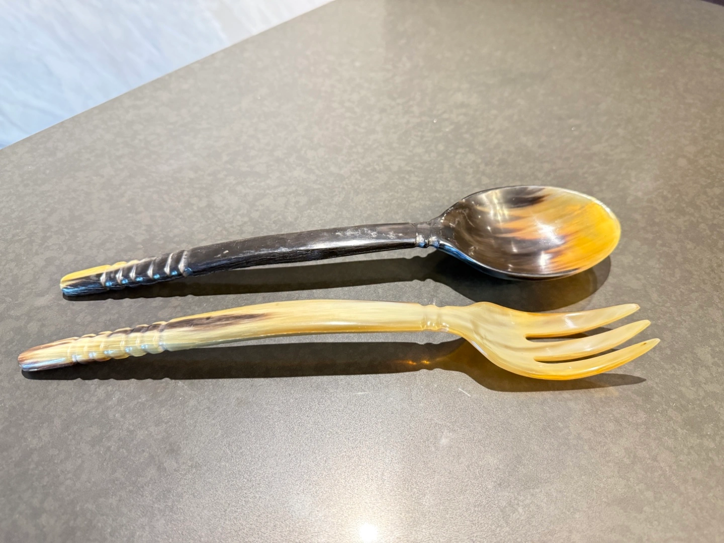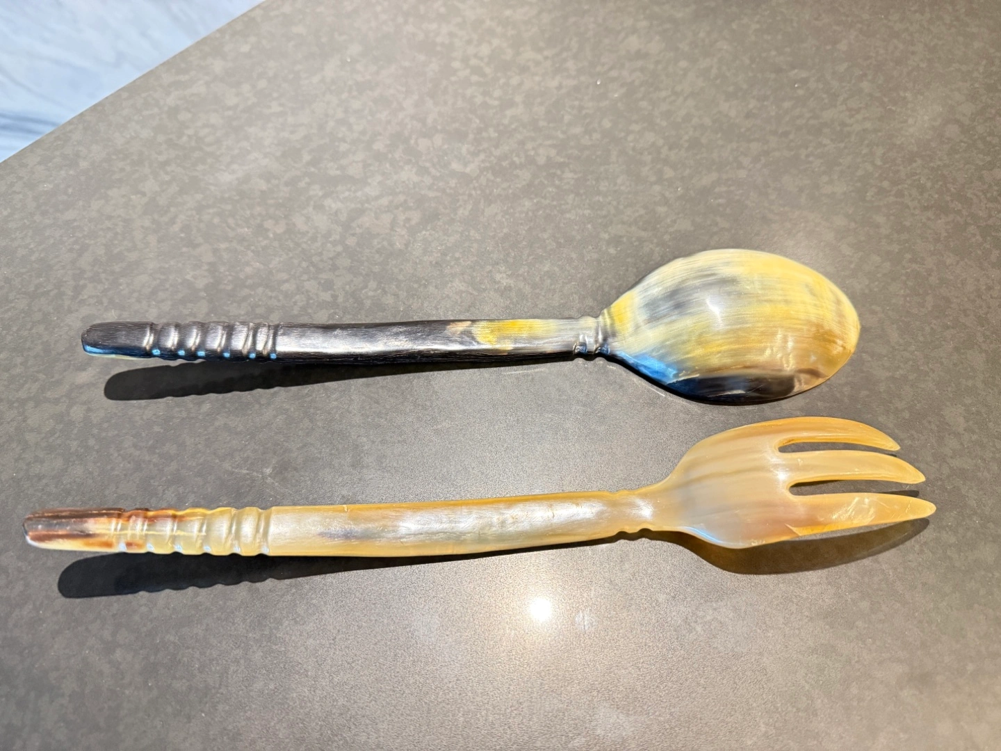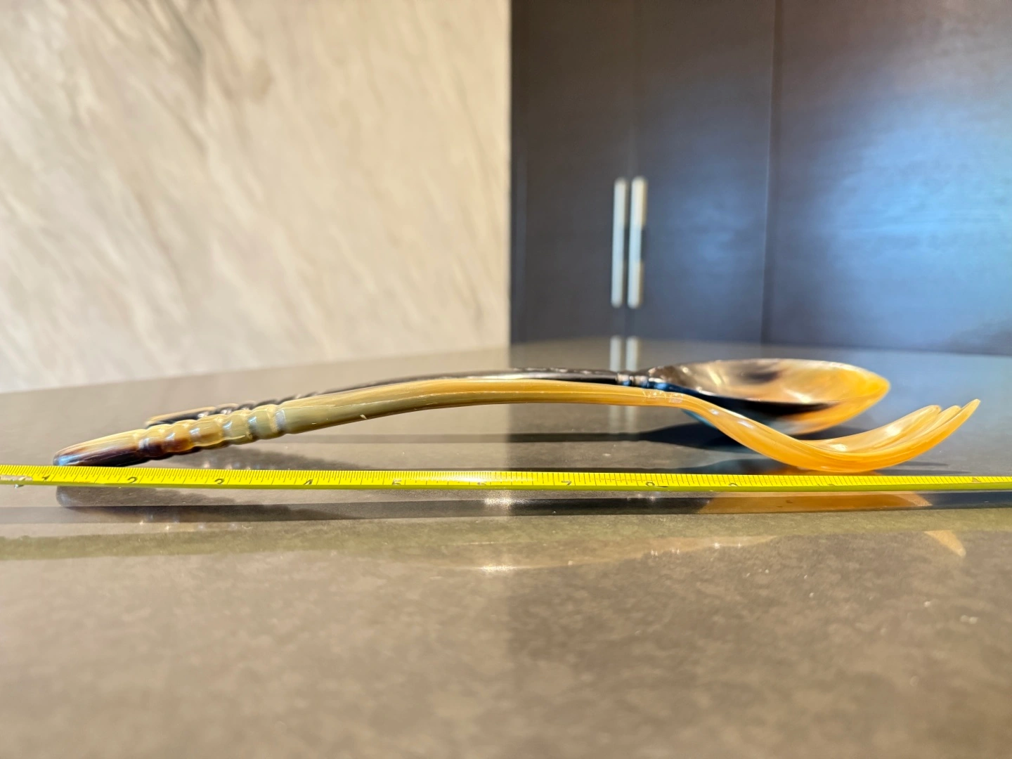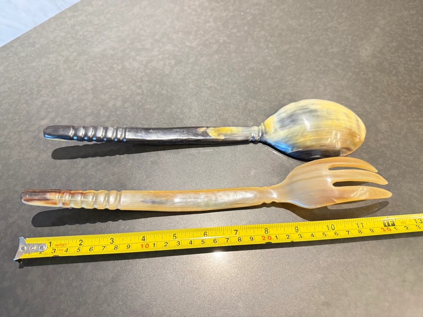 481Selling a unique vintage horn salad serving set, including a spoon and fork. The set is in good condition and would add a rustic touch to any table setting. The spoon and fork are made of horn and measure approximately 12 inches in length.
