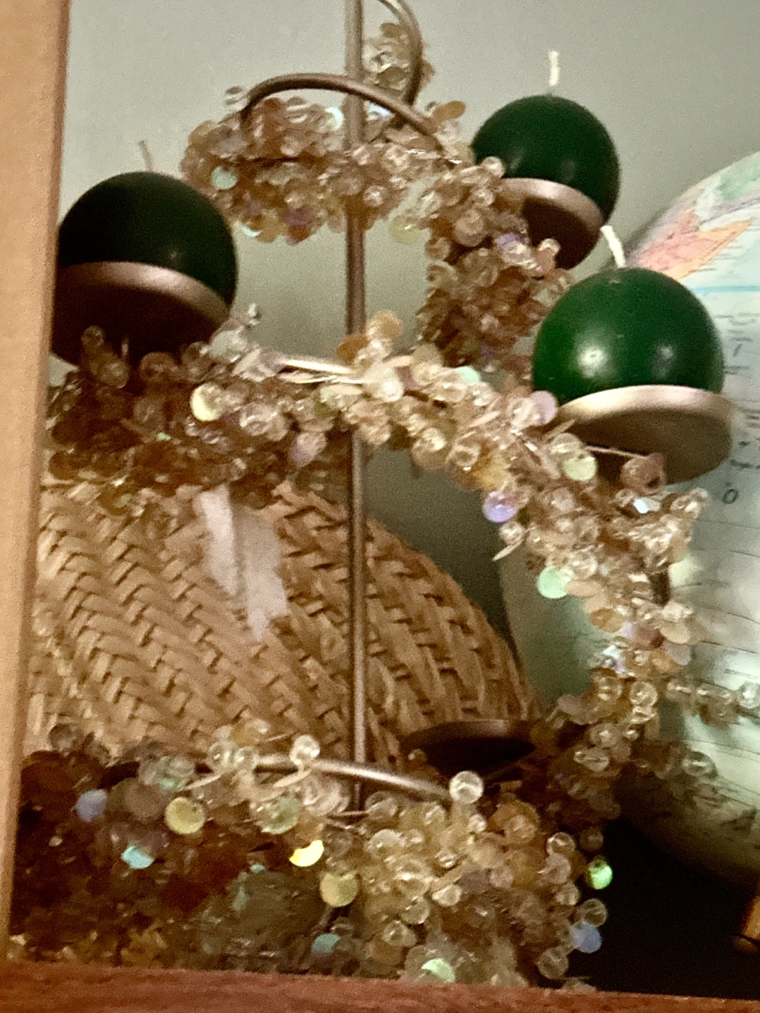 A decorative candle holder with beaded accents. It adds a touch of elegance to any room. Perfect for creating a cozy atmosphere! From party lite collection