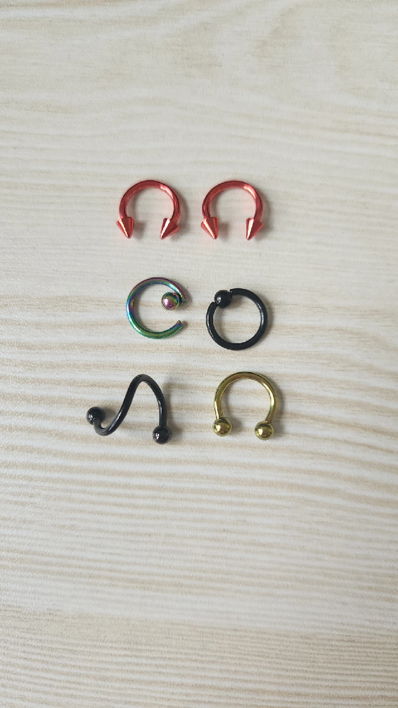 2x red horseshoe with cone ends 1x oil slick rainbow CBR 1x black CBR 1x twisty black with ball ends 1x gold coloured horseshoe