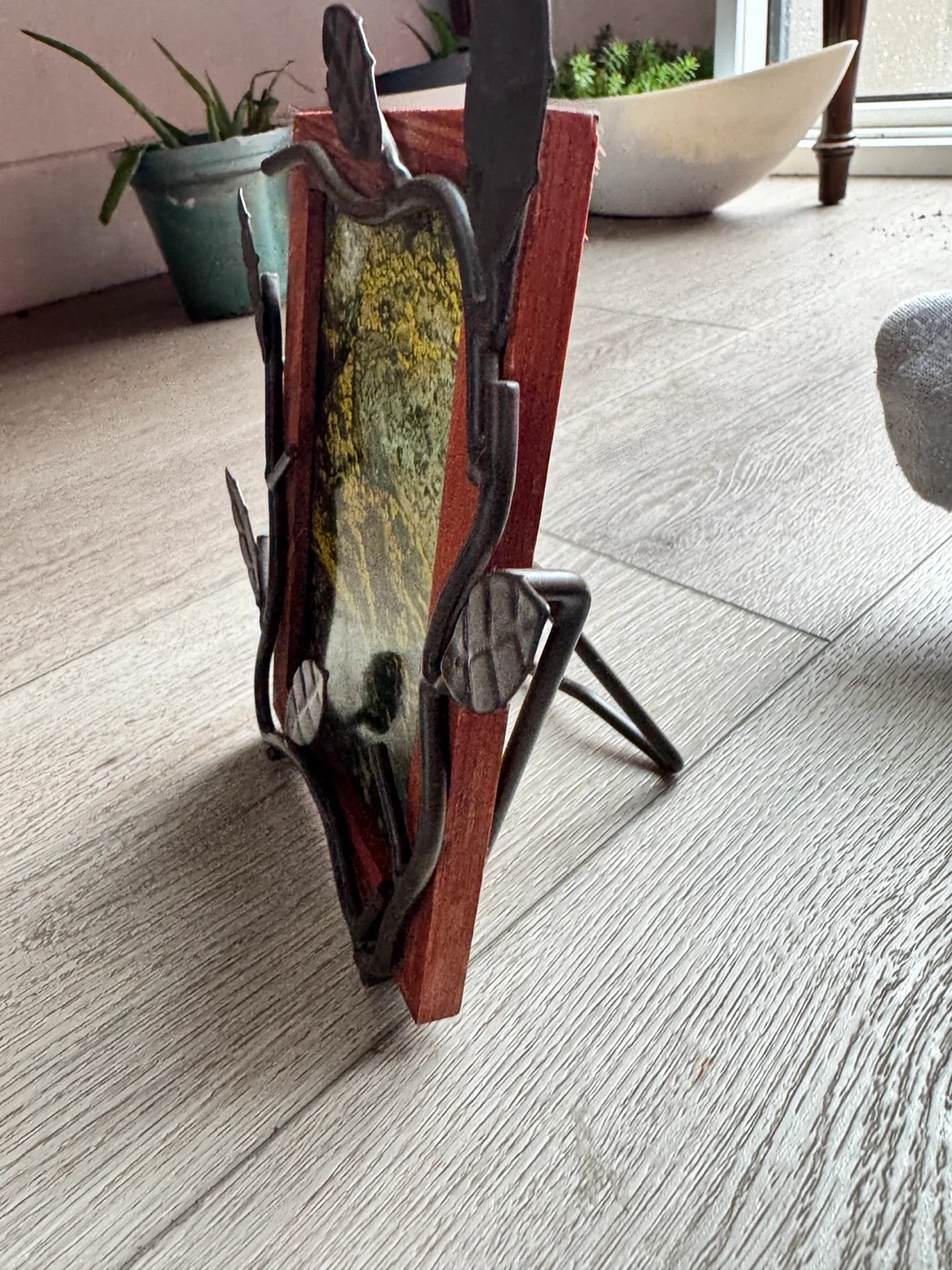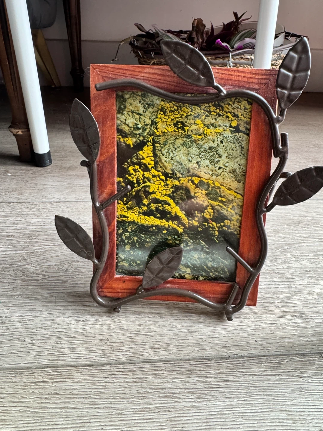 Rustic frame with wood base and metal leaf design. Adds a natural look to any room. Good condition.