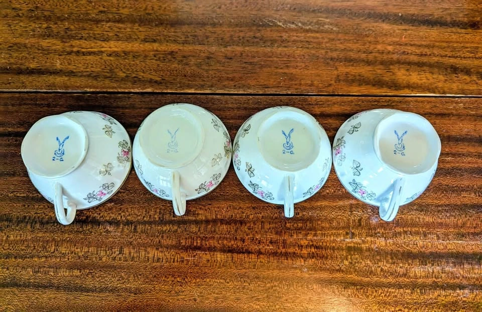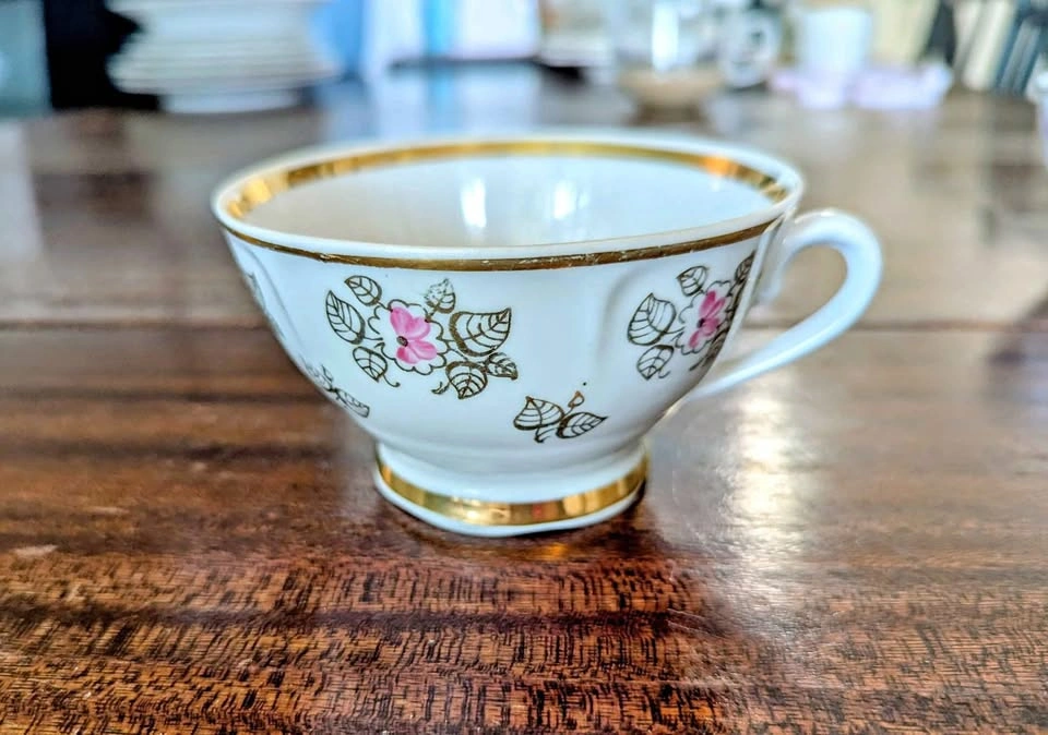 Gold plated teacups with beautiful pink flower and leaf designs. Interesting marking on the base of the teacup which only revealed it is manufactured in the USSR but can't find more details on it. No chips or cracks!