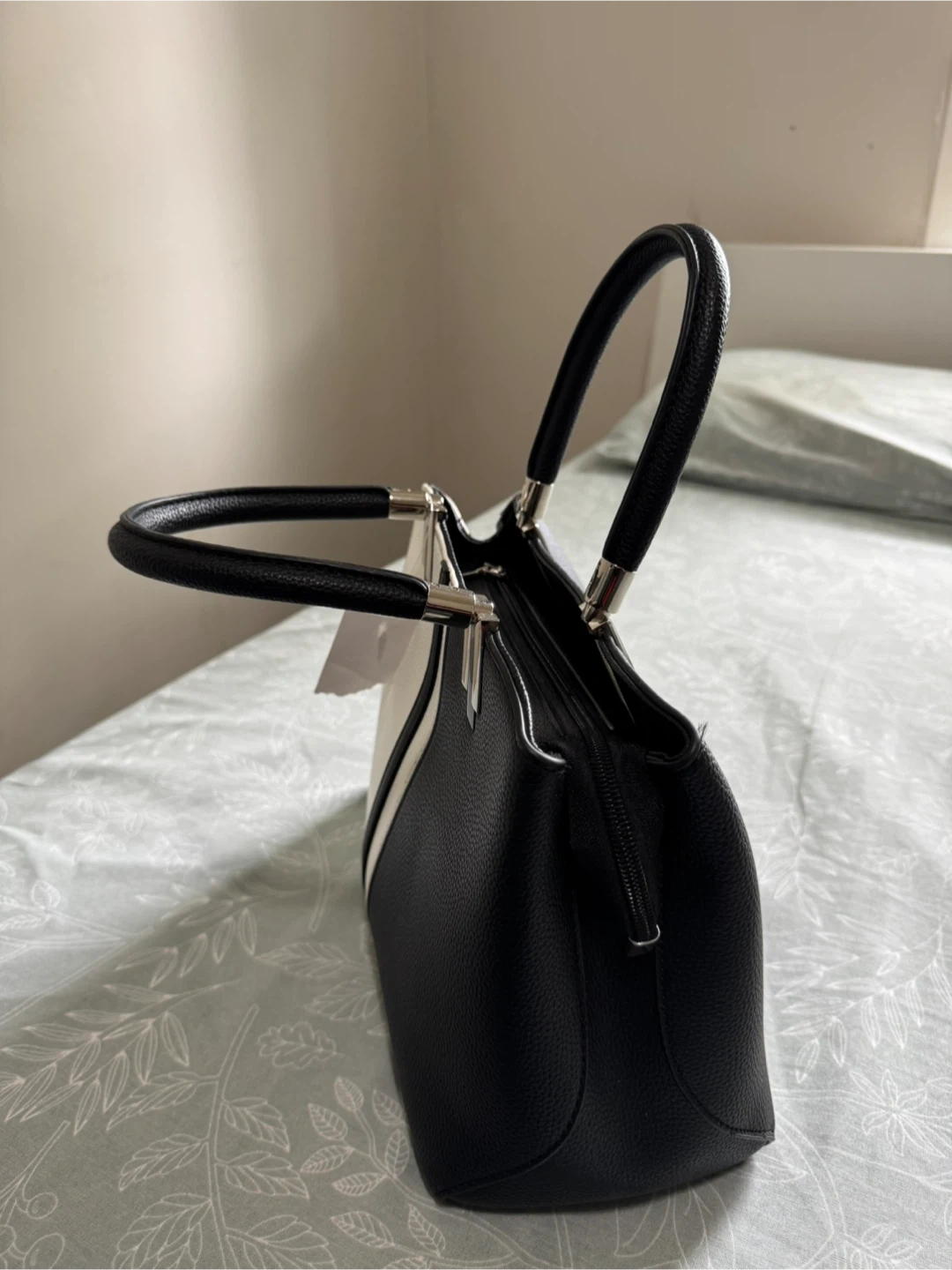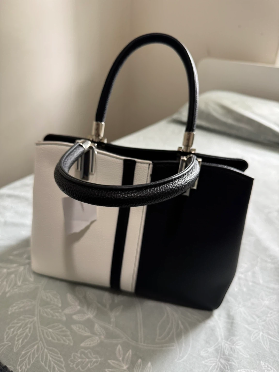 Selling a stylish black and white handbag. It's brand new and features a sleek design with sturdy handles. Perfect for everyday use!