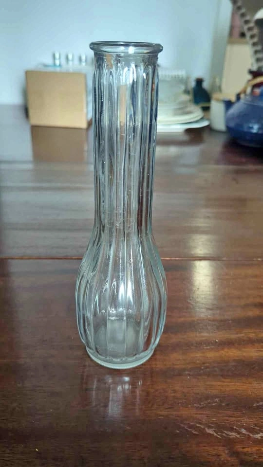 1960's Clear Pressed Glass Bud Vase Ribbed Panel - Scalloped Rim and Round Bottom - Clear 23 cms Tall - 4 cms wide at the opening - 5.5 cms wide at the base No chips or cracks!