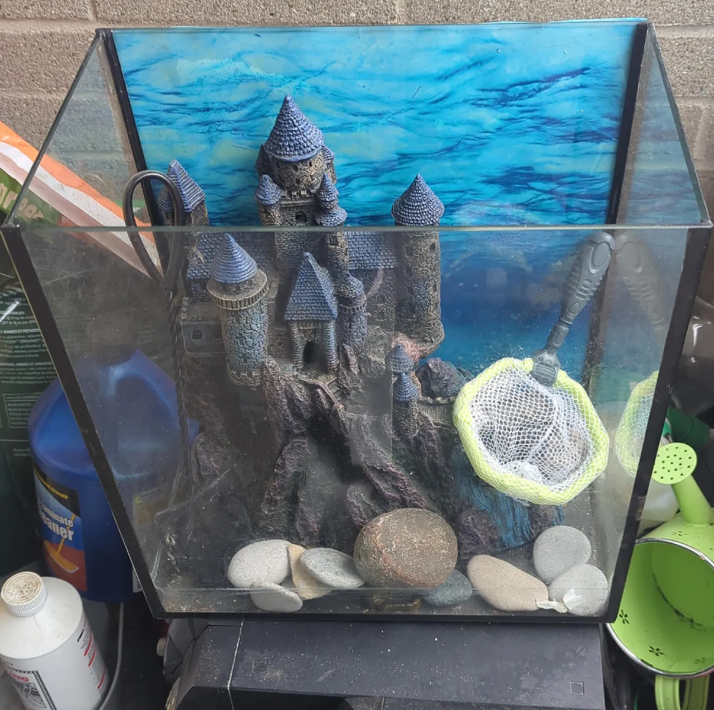 Selling a used fish tank that comes with a castle decoration, net, rocks, and background. It's perfect for setting up a small aquarium! I have the filter.