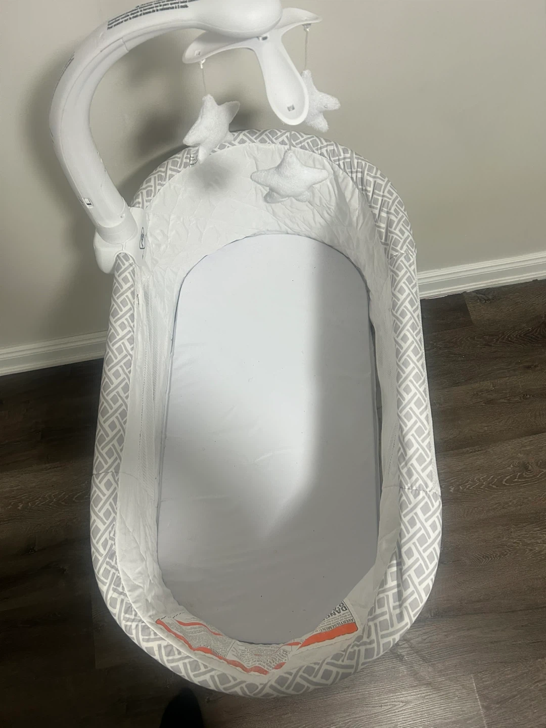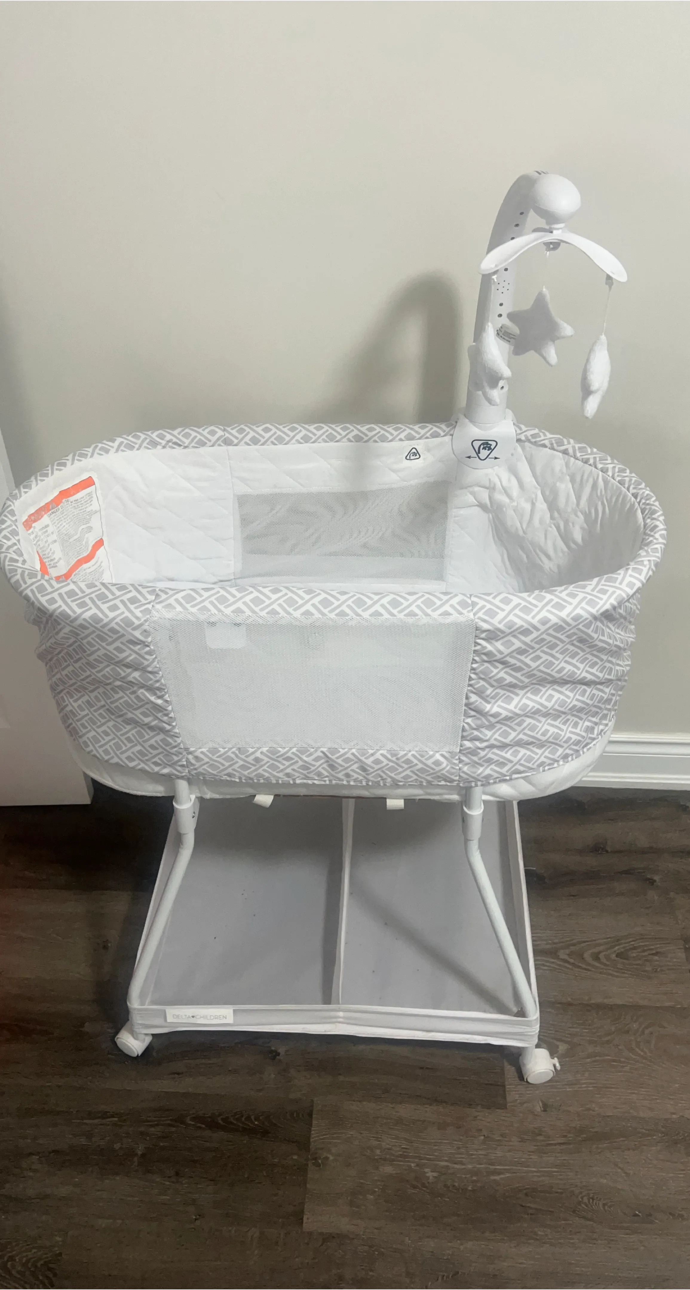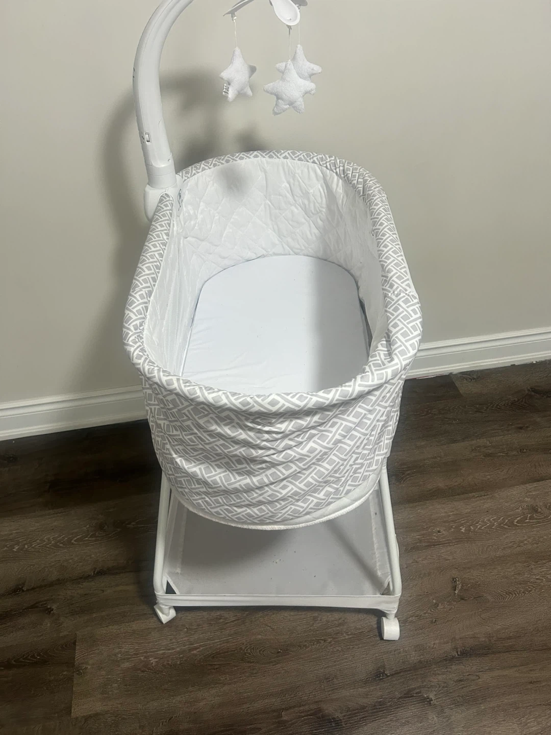 Selling a gently used baby bassinet in great condition! It features a cute mobile with hanging stars to keep your little one entertained. The bassinet is white and grey with a geometric pattern. Perfect for newborns!