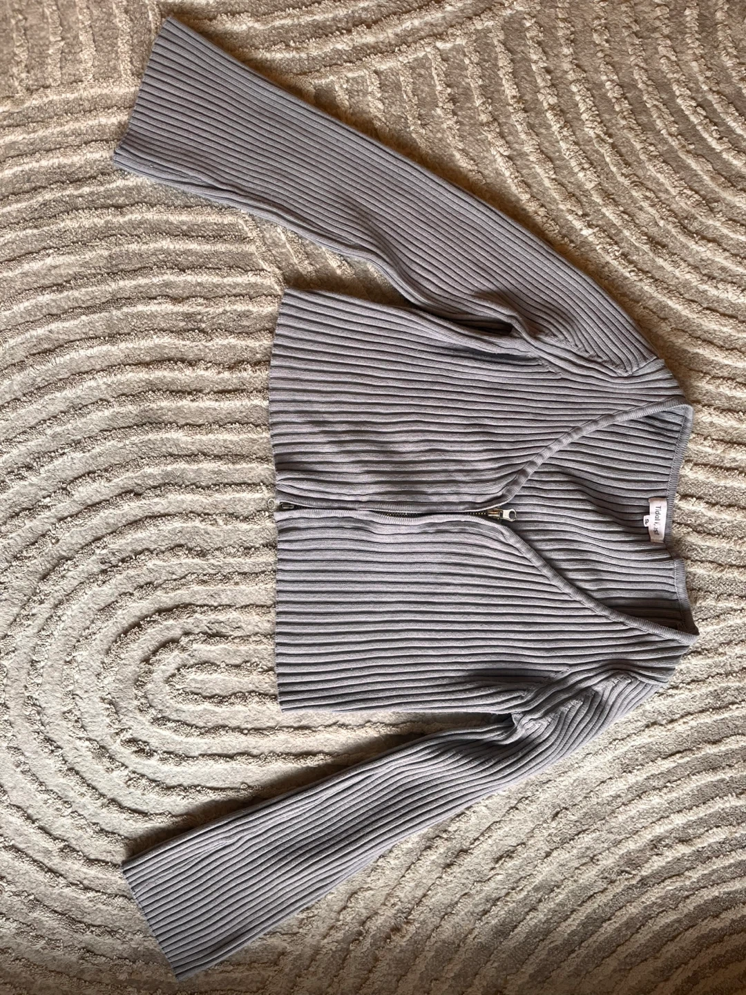 Here's a lovely ribbed cardigan. It's a size small and features a zipper closure. Perfect for layering!