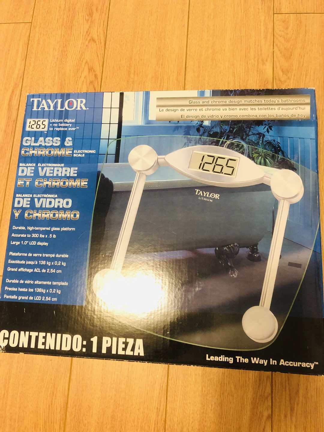 Selling a Taylor 1265 glass and chrome electronic scale! It's a durable, high-tempered glass platform that is accurate to 300 lbs. The scale also has a large 1.0" LCD display. The glass and chrome design matches today's bathrooms. Comes with the original box!