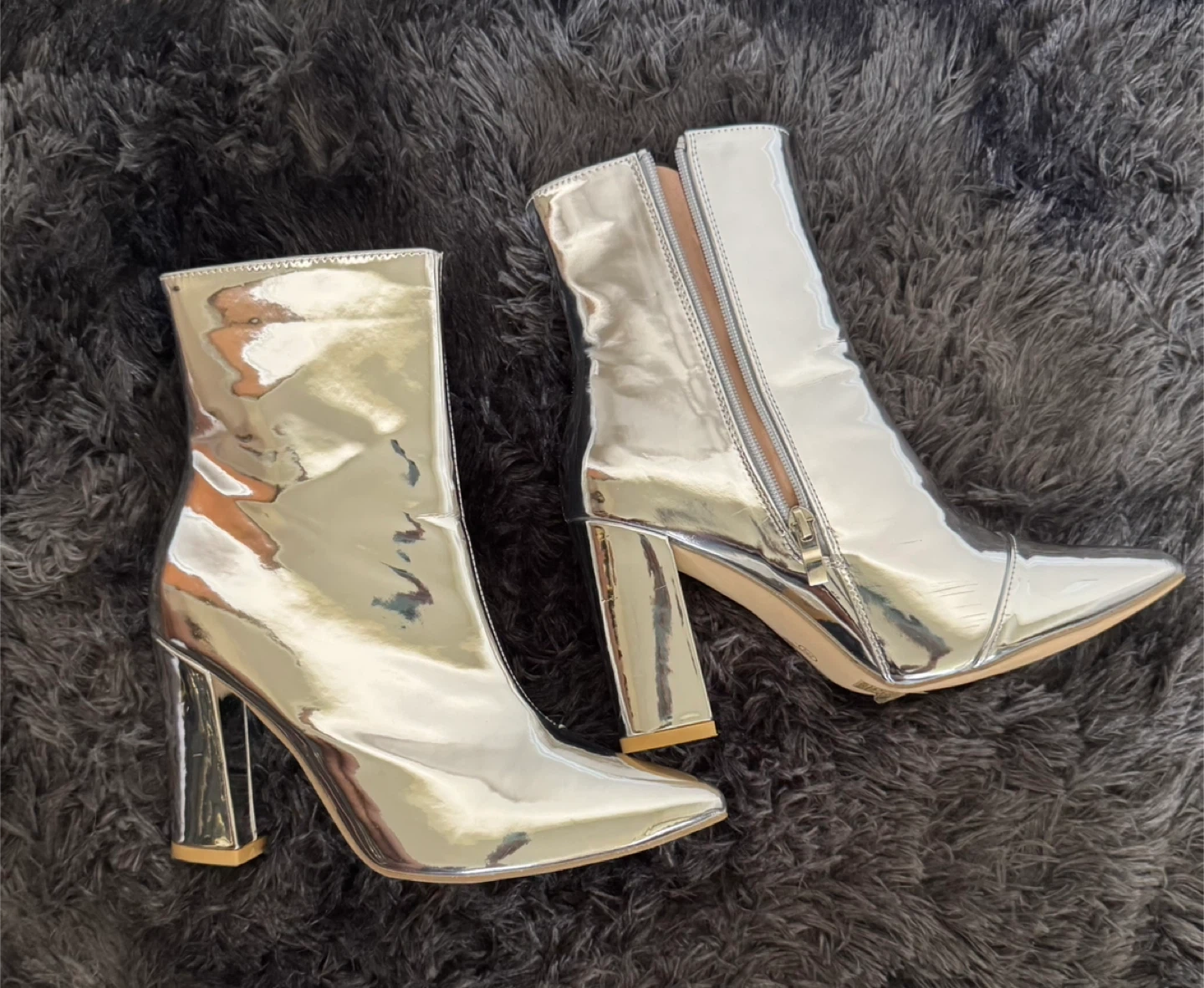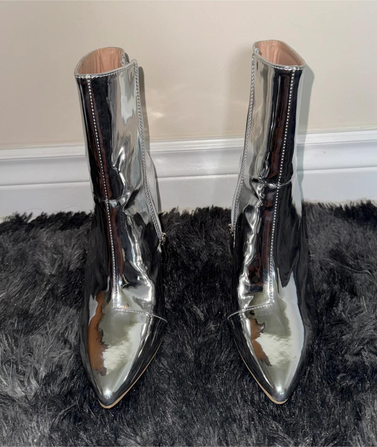 Selling a pair of shiny silver ankle boots in a size 8. They're in great condition and feature a sleek, modern design with a comfortable heel height. These boots are sure to make a statement!