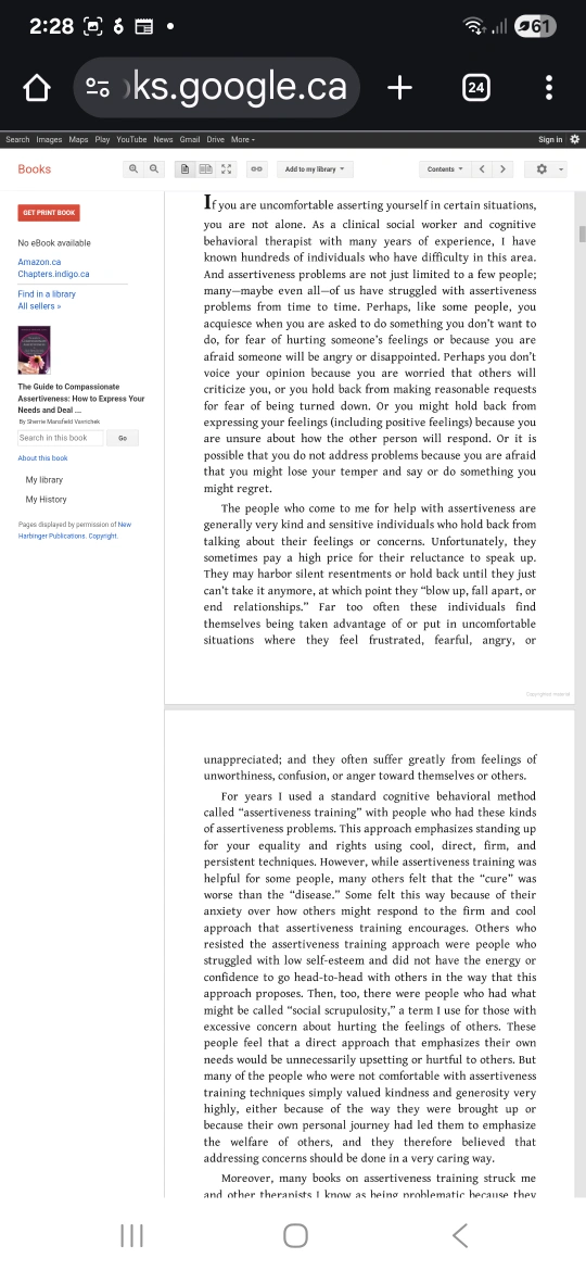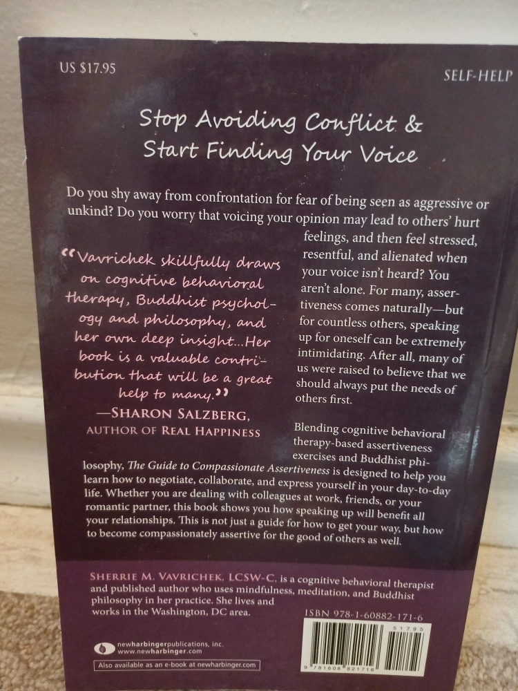 'The Guide to Compassionate Assertiveness' by Sherrie M. Vavrichek. This book provides guidance on expressing your needs and dealing with conflict while keeping a kind heart. It blends cognitive behavioral therapy and Buddhist psychology to help you navigate relationships at work, with friends, or in your romantic life.