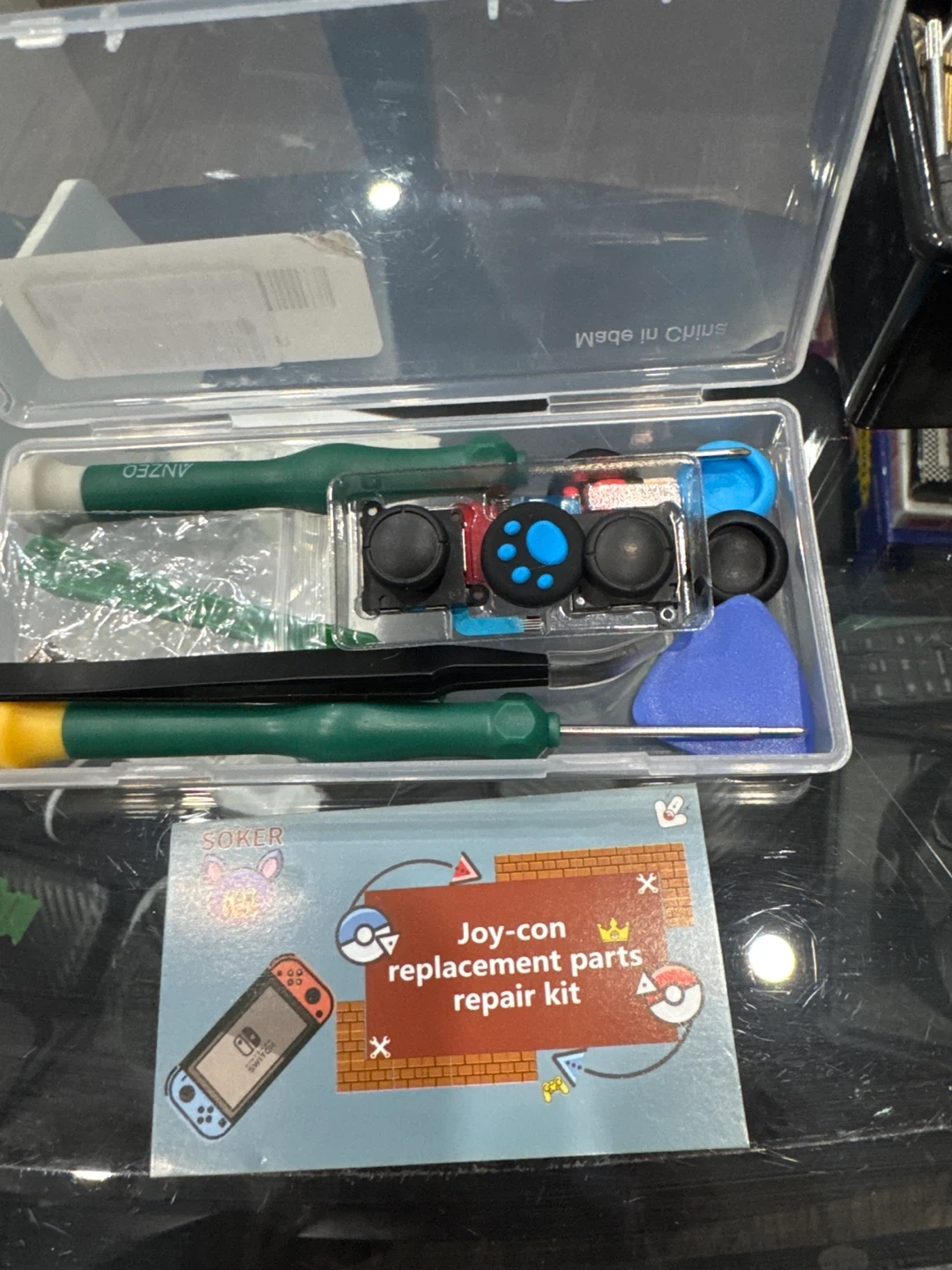 Selling a Joy-Con replacement parts repair kit. It includes the tools and parts needed to fix your Nintendo Switch Joy-Cons. Perfect for fixing drifting issues or replacing damaged parts! The kit is made in China.