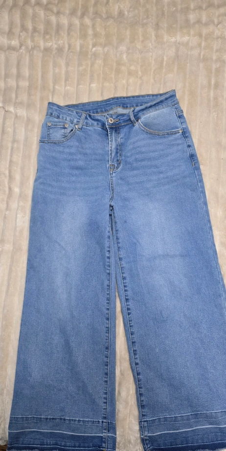 Wide leg jeans in a light wash denim. These are a size 10 and in good condition. Perfect for a casual look!
