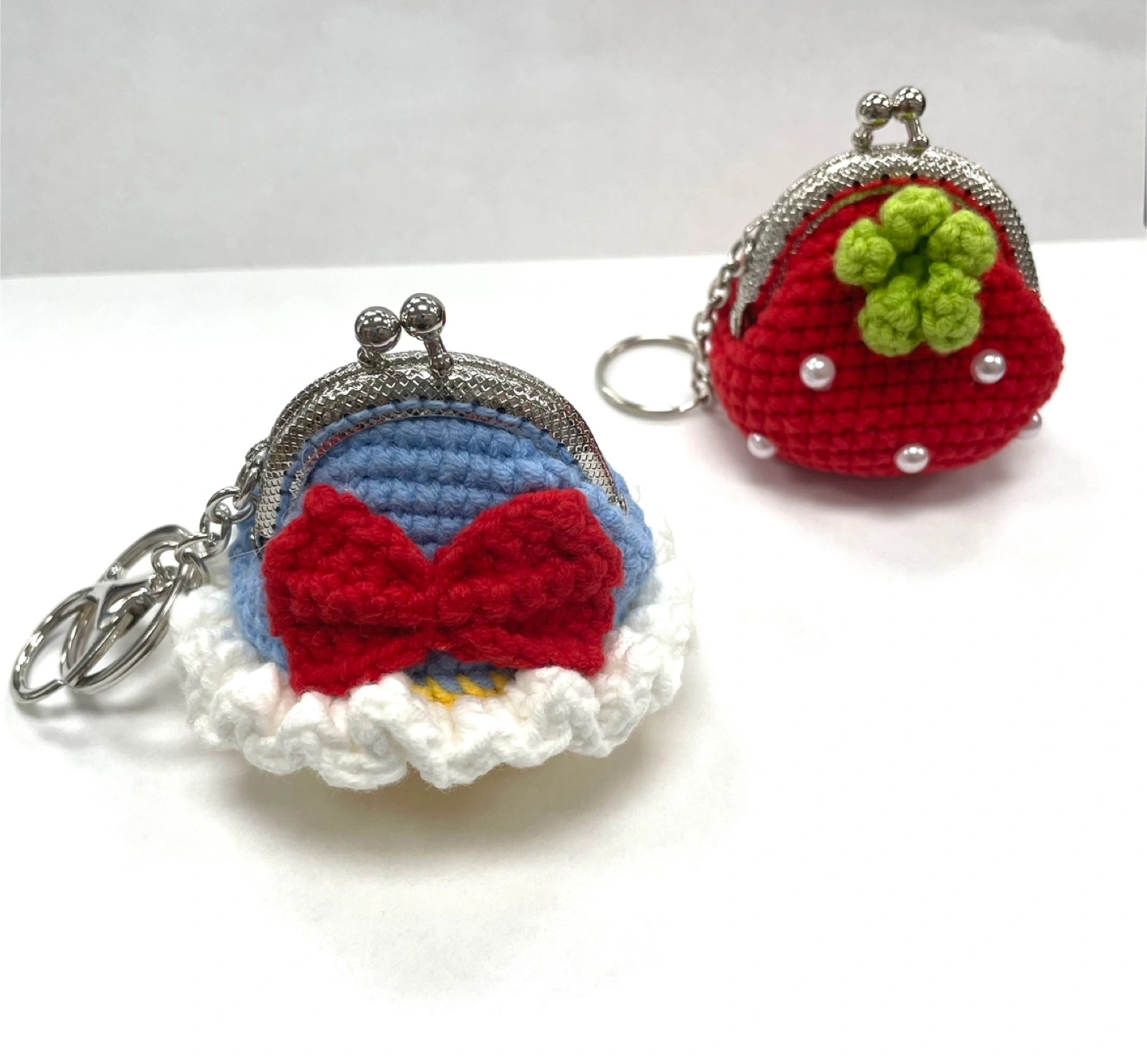 These adorable handmade crochet coin purses are perfect as keychains or bag charms! One is a cute blue bird design with a red bow, and the other is a sweet strawberry with pearl accents. They're both in great condition and ready to add a touch of handmade charm to your everyday life