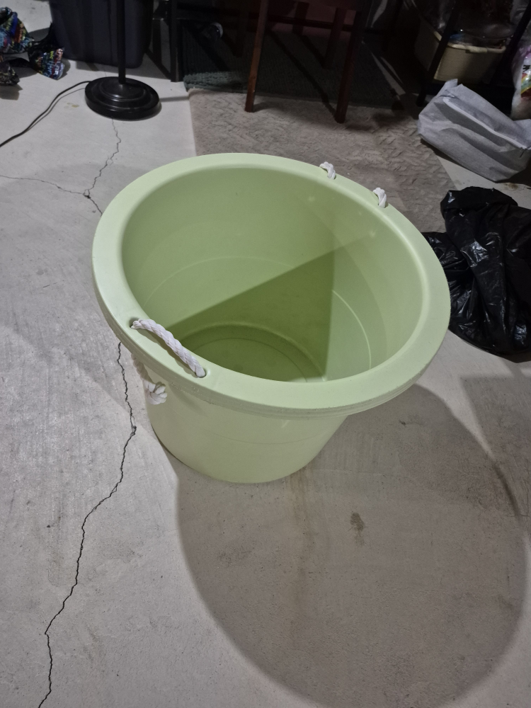 Selling a largelight green plastic bucket! It has rope handles for easy carrying. Perfect for various storage tasks such as toys / stuffies etc