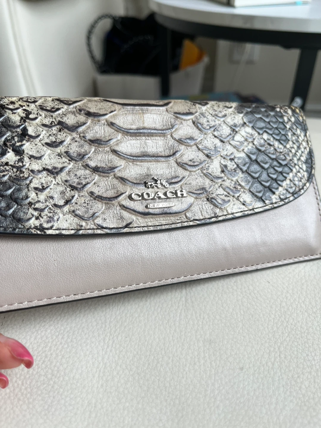 Selling a Coach wallet featuring snakeskin and leather accents! It's in great condition and perfect for keeping your essentials organized with style. The Coach logo is prominently displayed.