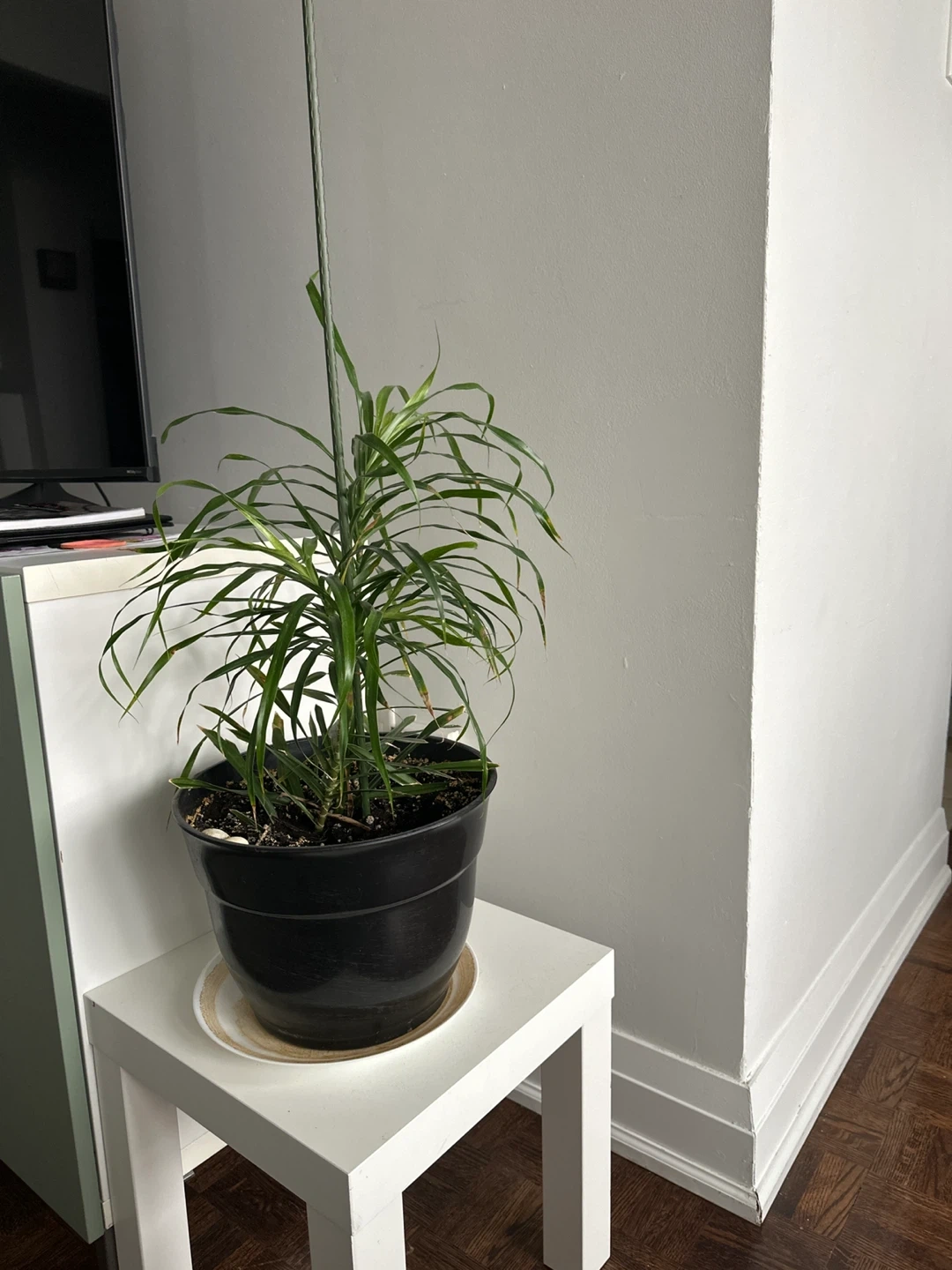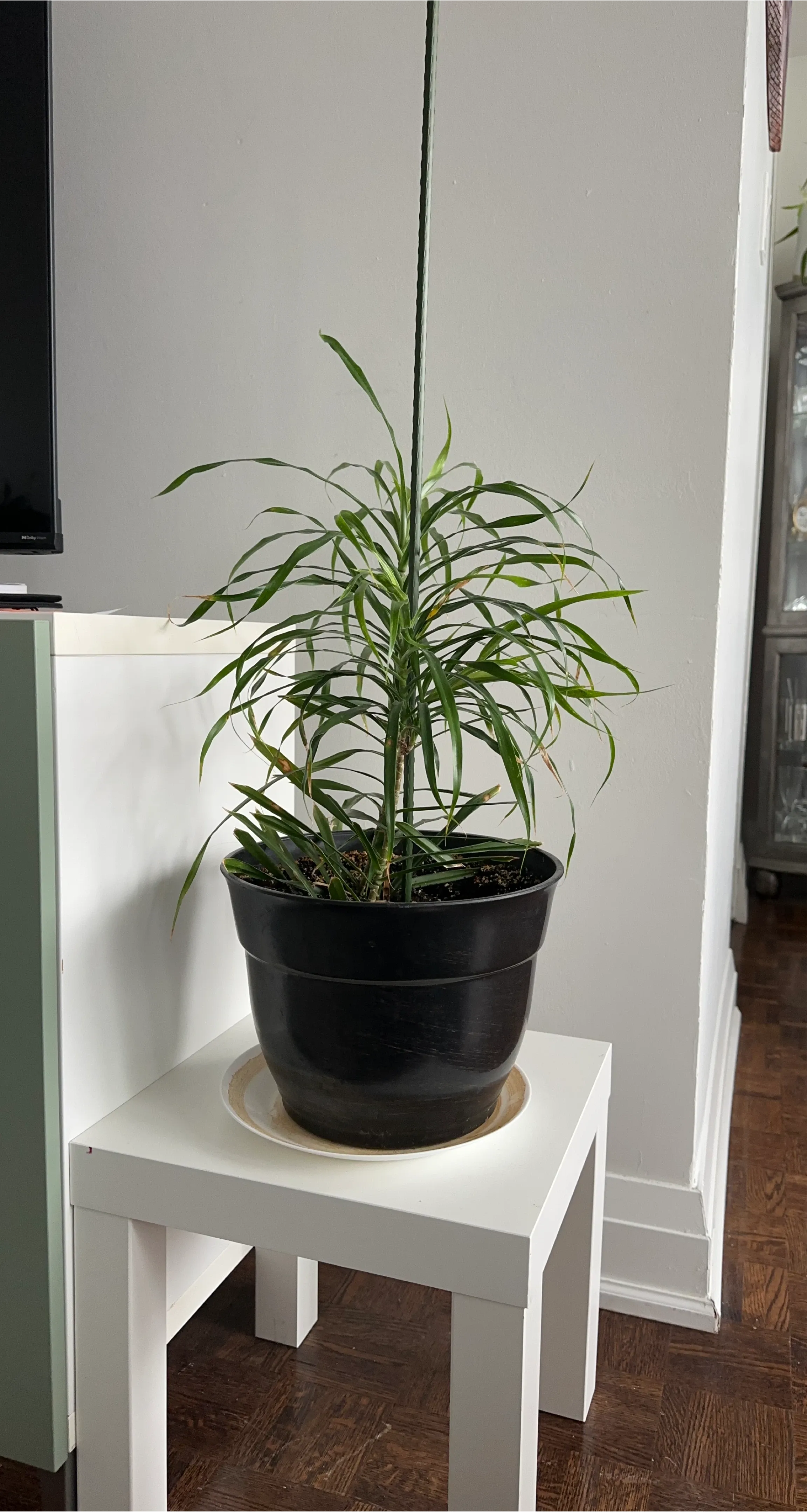 Selling a healthy Dracaena plant in a black pot. It's a great addition to any room and easy to care for! It's currently sitting on a small white table, which is not included.