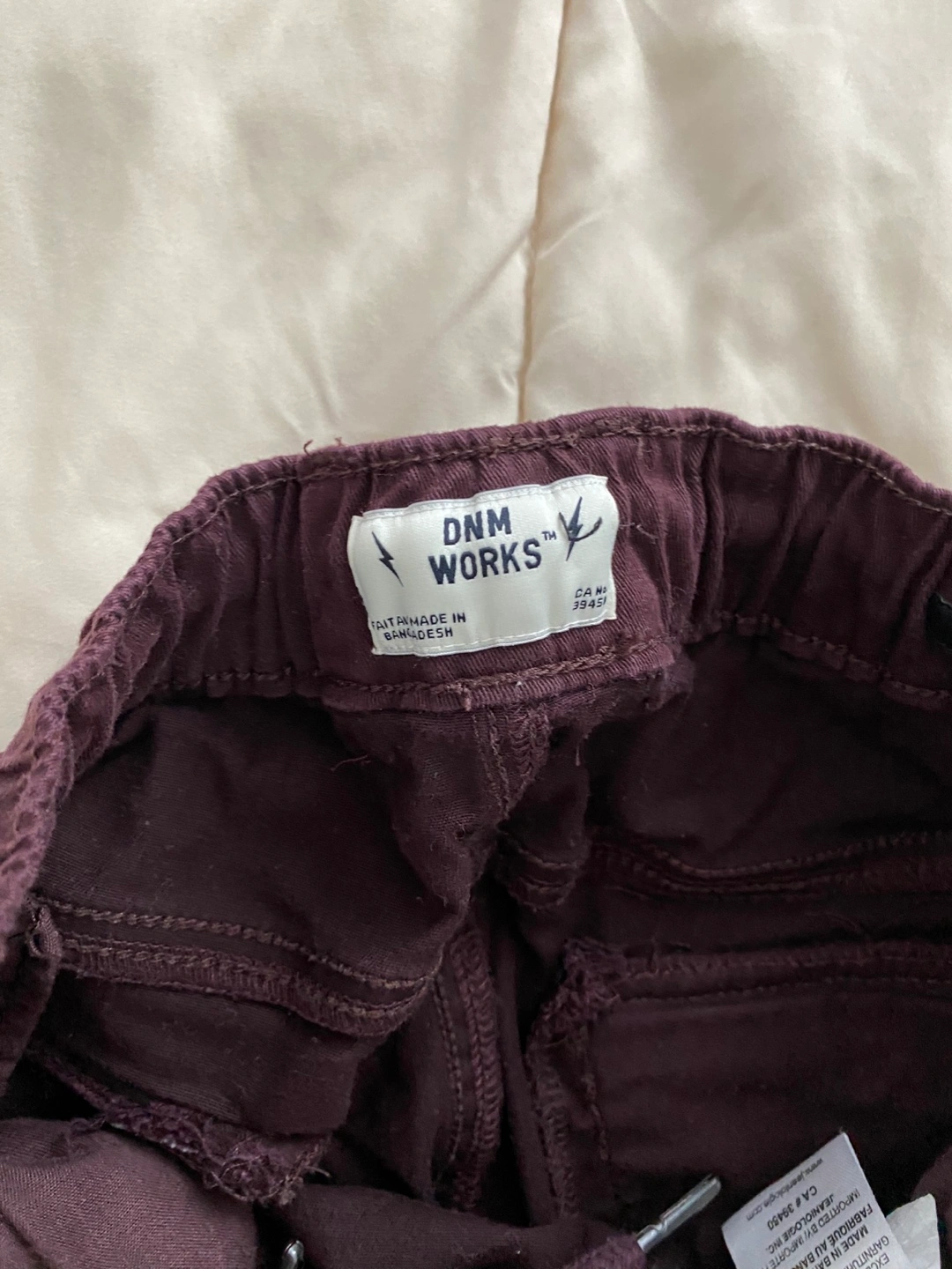DNM WORKS cargo pants in size L (32). They are a stylish burgundy colour and made of 98% cotton and 2% spandex. They are in great condition!