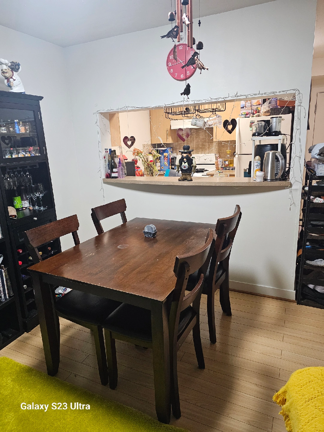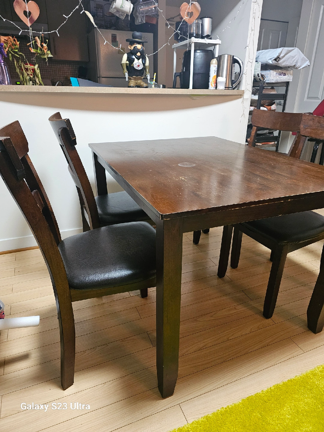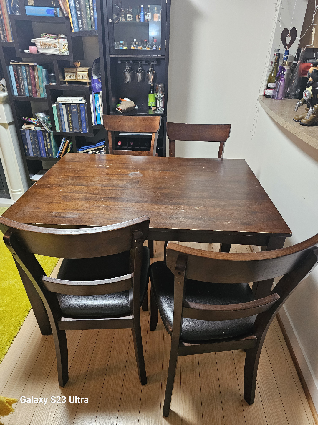 Selling a wooden dining table with four chairs. It's a great set for a small dining area or kitchen. The table is sturdy and the chairs are comfortable. Perfect for family meals or gatherings with friends. Table can be easily dismanted for moving.