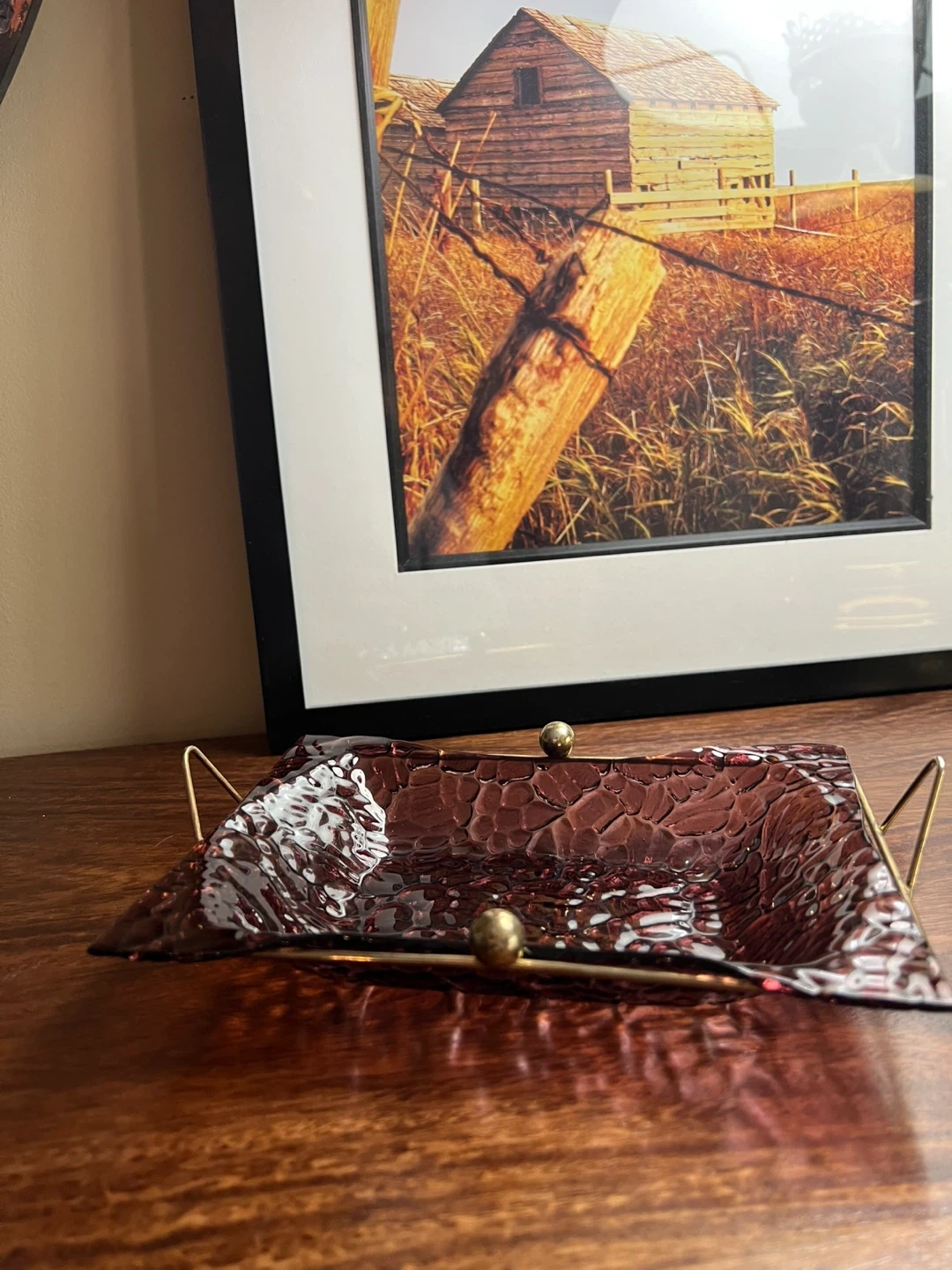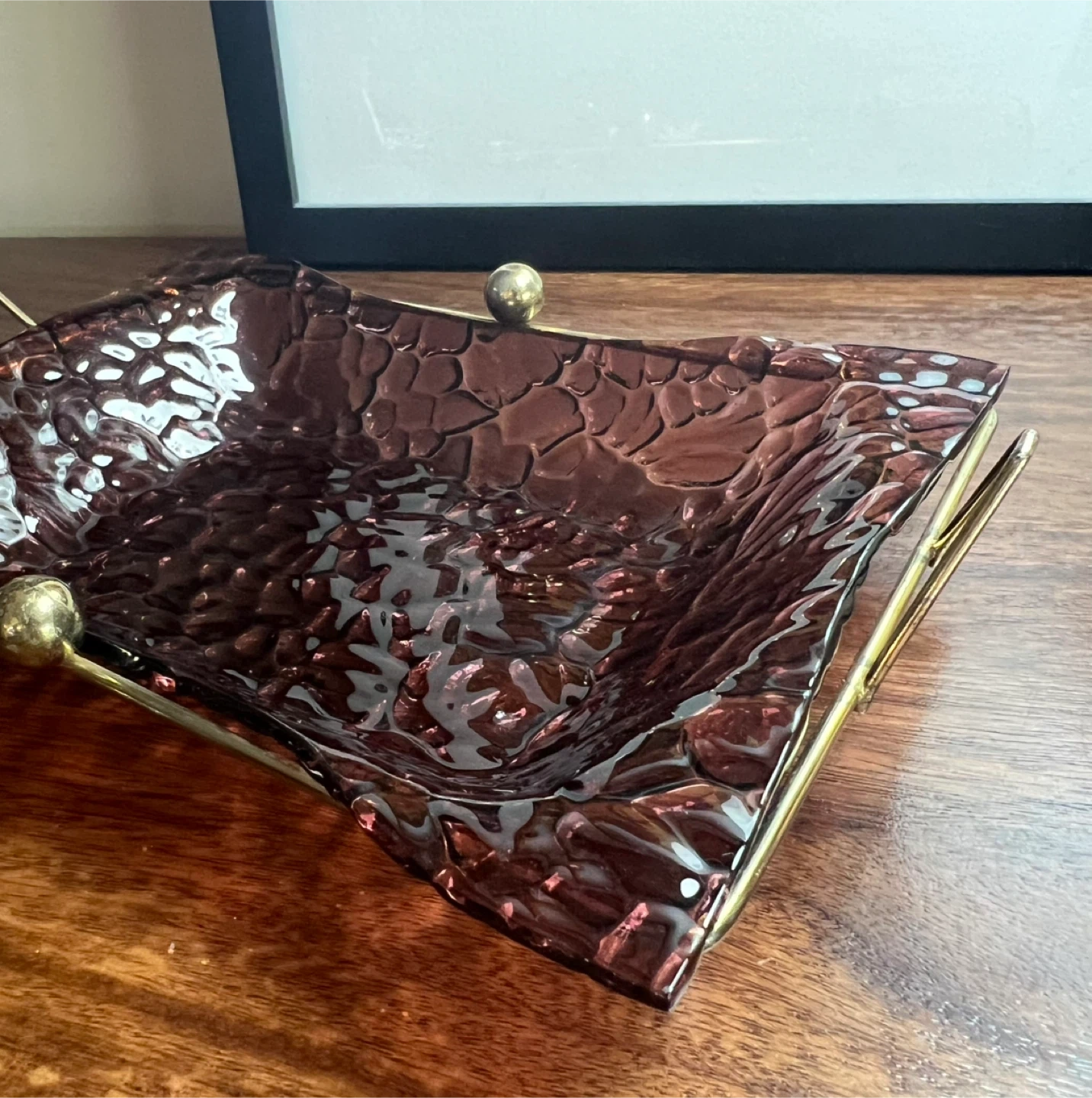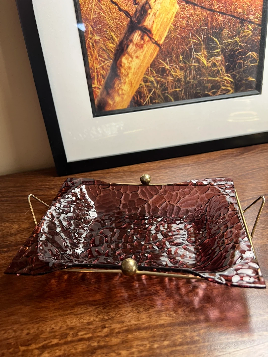 Textured glass and a brassy metal frame (affixed) Trinket?… Candy dish?… Serving tray?… Excellent condition 7.75” long and 5.75” wide Asking $10 Interested! Message me and please check my other listings…